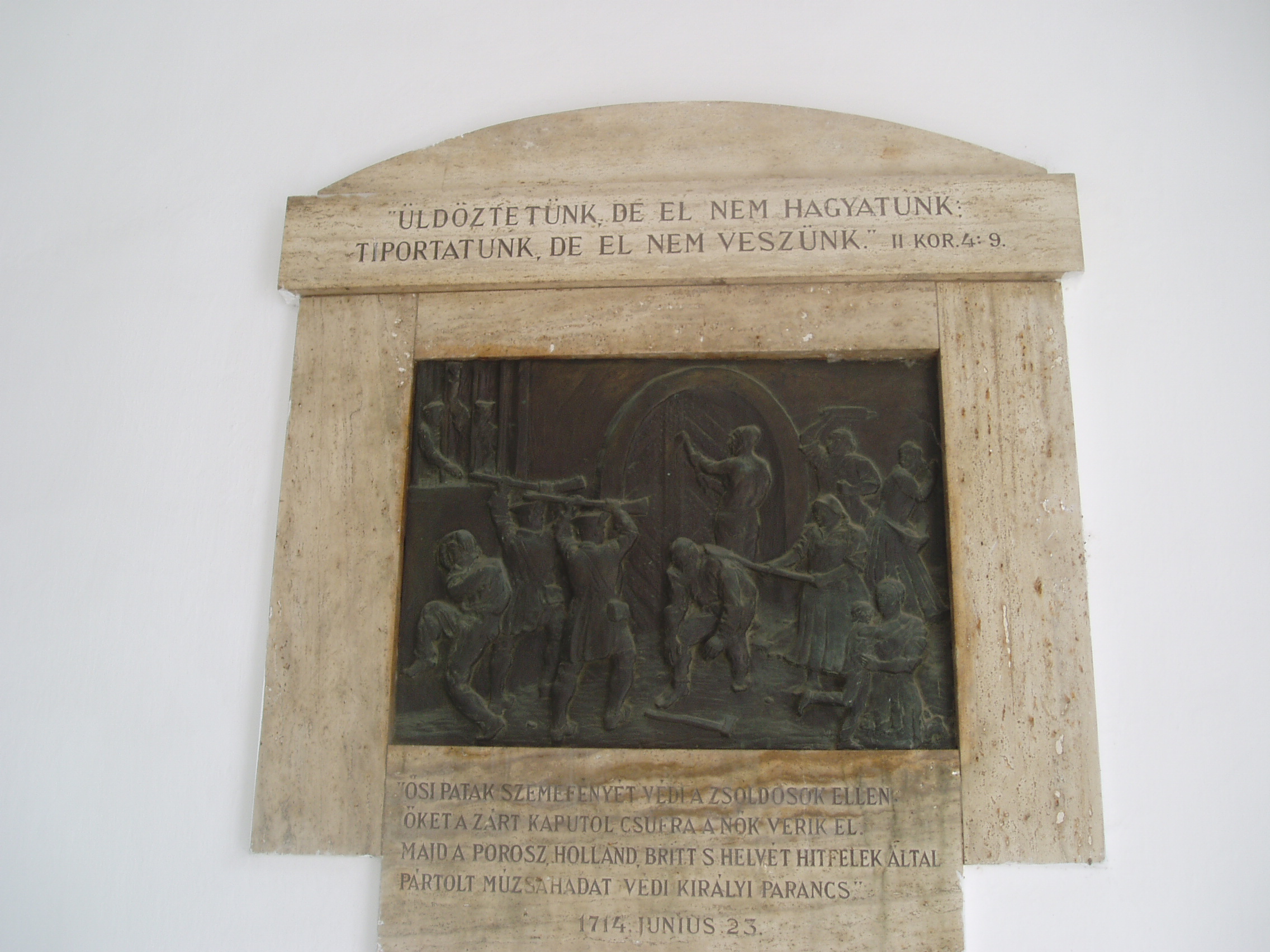 Nyilvános 1379 | 1843 | Sárospatak, Rákóczi utca 1. Református Kollégium | A kollégium főépülete, a Nagy Kollégium a Rákóczi út északi végén található, mely 1804–1814 között korai klasszicista stílusban épült. Szép ráccsal ellátott, háromíves nyílású kapuzat vezet be az un. „nagyportá”-ba, amelyet két sor vaskos pillér három hajóra oszt. Kétoldalt a falakon az iskolatörténet néhány fontosabb eseményének, illetve a kollégium nagy alakjainak bronz domborművű ábrázolásait helyezték el. A képen a Kollégium megvédésének emléktáblája látható (Szabados Béla alkotása, 1939). Felirata szerint 1714-ben, a Rákóczi-szabadságharc bukása után, amikor Patak a császáriak kezébe került, nők védték meg a Kollégiumot a zsákmányra vágyó zsoldoskatonákkal szemben. A fénykép 2007 augusztusában készült. Felh. irod.: Détsy Mihály: Sárospatak. Bp. Corvina, 1974 Látnivalók Borsod-Abaúj-Zemplén megyében. Miskolc, Well-PRess, 1995 www.sarospatak.hu/nevezetessegek |