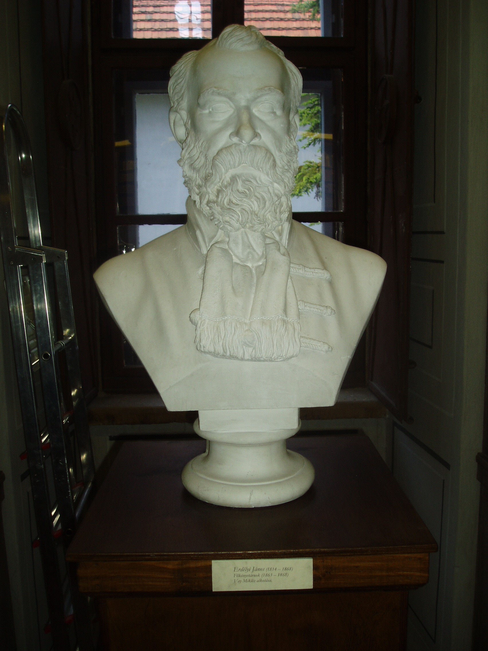 Nyilvános 1407 | 1814 | Sárospatak, Rákóczi utca 1. Református Kollégium könyvtára | Erdélyi János (1814-1868) költő, kritikus, esztéta, filozófus, tanár mellszobra Vay Miklós alkotása. Erdélyit, miután 1848/49-ben a Nemzeti Színház igazgatója volt, s Világos után üldöztetéseknek volt kitéve, 1851-ben meghívták a sárospataki főiskola bölcseleti tanszékére. 1863-tól a kollégium "könyvtárnoka" lett, ezzel együtt a magyar irodalmi tanszéket foglalta el. Nagyszabású könyvtári terveiből egyedül az állomány szak szerinti elrendezését tudta korai halála előtt megvalósítani. Munkáját utódja, Szinyei Gerzson fejezte be. A fénykép 2007 augusztusában készült. Felh. irod.: www.gradatio.hu/nagykonyvtar |