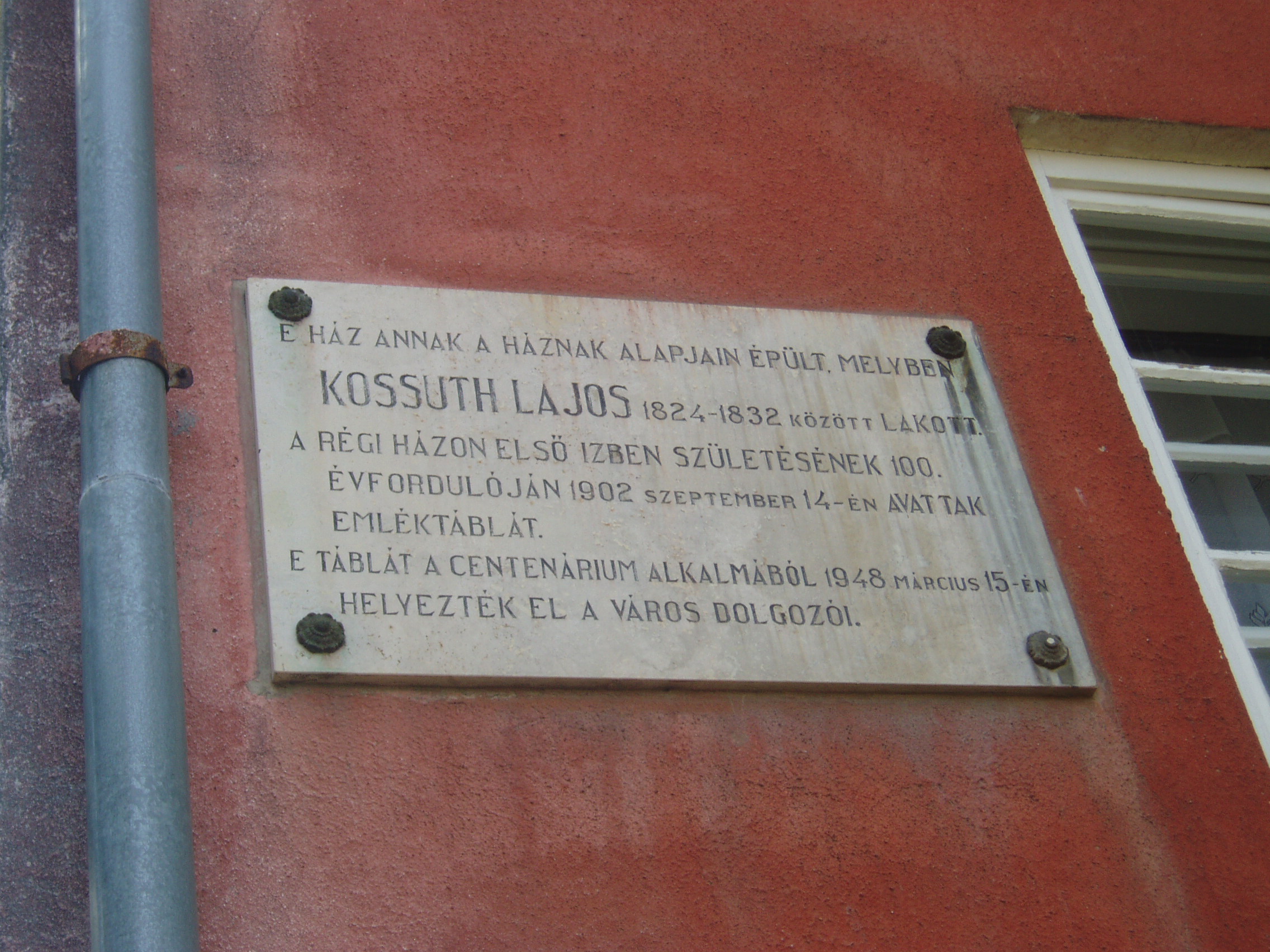 Nyilvános 1387 | 2244 | Sátoraljaújhely, Hősök tere 8. | Az emléktábla tanúsága szerint ez a ház annak a régi háznak alapjain épült, amelyben a Kossuth család 1824 és 1832 között lakott. Kossuth Lajos szülei - Kossuth László, az Andrássy grófok uradalmi ügyésze és Weber Karolin - házasságkötésüket követően Monokra költöztek szolgálati lakásba. Ott született meg 1802. szeptember 19-én Kossuth Lajos. A szülők a néhány hónapos csecsemővel Olaszliszkára költöztek (ott éltek Kossuth anyai nagyszülei). 1808-ban, a tehetséges kisfiú iskoláztatása miatt Sátoraljaújhelyen telepdtek le (lásd: Sátoraljaújhely, Móricz Zs. u. 17.), ahol Kossuth Lajos a piarista iskola (lásd: Sátoraljaújhely, Deák F. u. 10-12.) növendéke lett. Amikor a Kossuth család ebben a házban élt, a húszas éveiben járó Kossuth Lajos már jogot végzett fiatalember volt. 1821-24 között Pesten tevékenykedett, de 1824-ben hazatért Sátoraljaújhelyre, hogy egyetlen fiúként könnyíthessen idősödő apja terhein és segítsen a család egyre növekvő gondjain, amelybe időközben több lánytestvér is született. A család eredeti házát Kossuth Lajos születésének 100. évfordulóján, 1902-ben jelölték meg emléktáblával. Az utódépületen látható táblát 1848 centenáriumán állították. A fénykép 2007 augusztusában készült. Felh. irod.: Ács Tibor: Kossuth Lajos. Bp. MH OKAK, 1994 http://teroses.atw.hu/eletrajz.htm |