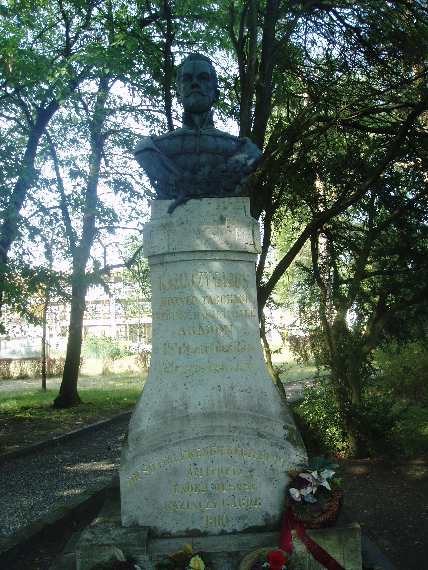 Nyilvános 1393 | 1910 | Széphalom: A Kazinczy család sírkertje - Kazinczy Lajos szobra | A Kazinczy Emlékcsarnok parkja - Kazinczy Ferenc egykori kúriájának kertje - ma természetvédelmi terület. A mauzóleumból fasor vezet a Kazinczy család sírkertjébe. A kis temető helyét 1806-ban, első gyermeke, az egyéves korában elhunyt Iphigenia halálakor Kazinczy maga jelölte ki. Már akkor megírta barátainak, hogy felesége és ő is oda fognak temetkezni. Legkisebbik fiuk, Lajos, Aradon szenvedett vértanúhalált a honvédsereg ezredeseként. 1849. október 25-én, 29 éves korában végezték ki. Földi maradványait az aradi vársánc rejti. Szülei sírjának közelében felállított mellszobra idézi emlékét. A szobor másolata a sárospataki kollégium kertjében látható (lásd: Sárospatak, Iskolakert: Kazinczy Lajos). A fénykép 2007 augusztusában készült. Felh. irod.: Látnivalók Borsod-Abaúj-Zemplén megyében. Miskolc, Well-PRess, 2004 www.vendegvaro.hu Pávai Gyula: Kazinczy Lajos emléktáblája Aradon. = Széphalom. A Kazinczy Ferenc Társaság Évkönyve 13. kötet, 2003 |