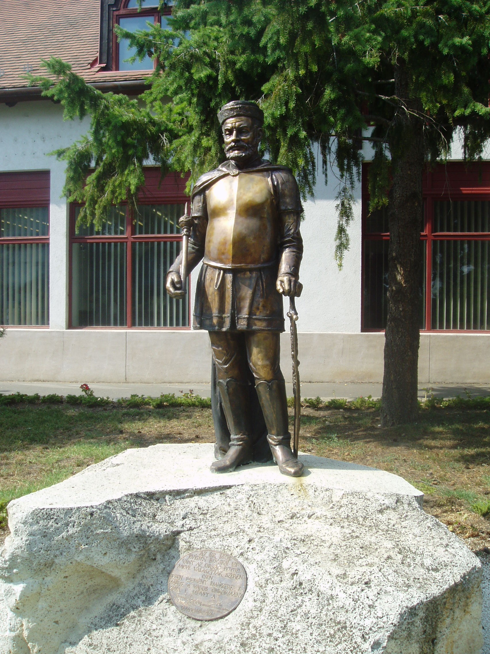 Nyilvános 1402 | 1826 | Szerencs, Kossuth tér 4. Bocskai István szobra a Református templom előtt | A református templom előtt áll az egész alakos Bocskai-szobor, Ekker Róbert és Simorka Sándor szobrászművészek 2005-ben készült alkotása. Bocskai Istvánt a szerencsi református templomban 1605. április 17. és 20. között megtartott nemzetegyesítő országgyűlésen választották Magyarország fejedelmévé. Ekkor mondták ki a protestánsok vallásszabadságát. Bocskai 1606. március 9-én szabad királyi várossá emelte Szerencset, s lakosainak jelentős kiváltságokat adott. A szobrot 2005. április 20-án, a szerencsi országgyűlés 400. évfordulója alkalmából avatták fel. A fénykép 2007 augusztusában készült. Felh. irod.: Fazekas Lászlóné: Szerencs. Szerencs, Szerencsi Hírek Szerkesztősége, 1997 |