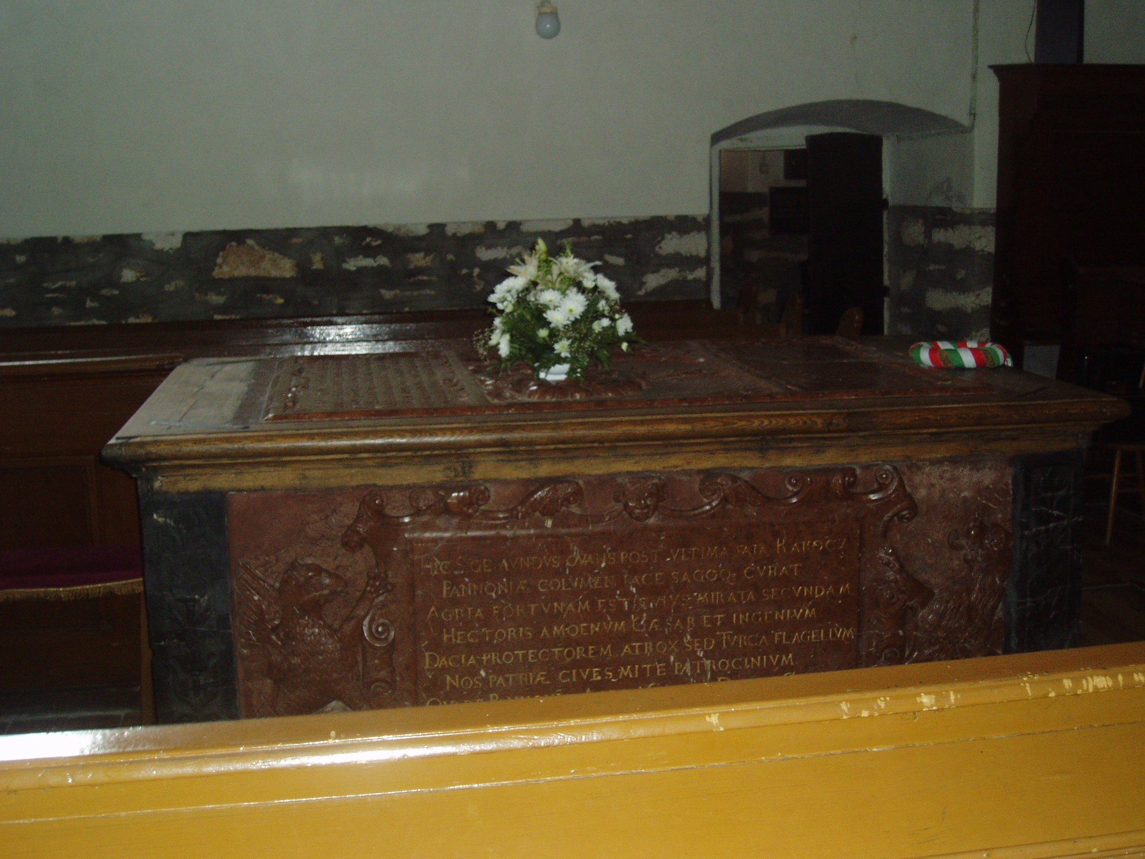 Nyilvános 1375 | 2128 | Szerencs, Kossuth tér 4. Református templom - Rákóczi Zsigmond tumbája | Szerencs legrégibb temploma a XIII. században épült eredetileg román stílusban. Az épületet 1480-ban átalakították, ekkor készült a középen álló gótikus torony. Az épületet gótikus támpillérek fogják körül. A templomot 1595-ben adományozta Rákóczi Zsigmond református hittársainak, az ő támogatásával jelentős átalakításokat is végeztek rajta. A templom nemcsak építészetileg nevezetes, hanem jelentős történelmi emlékhely is. 1605-ben az e falak között tartott országgyűlésen választották Bocskai Istvánt Magyarország fejedelmévé. A templom hajójában található Rákóczi Zsigmond (1544-1608) címerrel ékesített vörös márány szarkofágja (tumbája), amelyet 1618-ban a fejedelem három fia, György (1630-tól erdélyi fejedelem), Zsigmond és Pál készíttetett. A síremlék tetején levő latin szöveg fordítása: "Tekintetes és nagyságos felsővadászi Rákóczi Zsigmond, Borsod vármegye főispánja, a magyar király néhai lefőbb tanácsosa, először Szendrő, azután pedig Eger kapitánya és Erdély fejedelme, a magyarországi részek ura és a székelyek ispánja számára állíttatott jeles címer, akinek erénye gyakrabban híresedett el Magyarországon legnagyobb örvendezések közepette. Aki meghalt az ő kegyeletes szülőhelyén, Felsővadászon az 1608. évi december hó 5-én, midőn innen-onnan 64 évig élt. Három gyászoló fia: Rákóczi György , Zsigmond és Pál az ő legkedvesebb édesatyjuknak, aki irántuk és a haza iránt jól érdemesült." A szarkofág nyugati oldalán a következő felirat olvasható: "Tebenned reméltem Uram, hogy nem leszek porrá mindörökké! " A déli oldalon Miskolczi Csulyak István prédikátor verse őrzi Rákóczi Zsigmond emlékét: "Itt nyugszik végső lehelete után a békében és háborúban győzedelmes Rákóczi zsigmond, Magyarország oszlopa, akinek Eger csodálta szerencséjét, a császár fővezérének kies lángelméjét is, Erdély oltalmazóját, a kegyetlen török pedig ostorát, mi honfiak az ő kegyes atyai indulatát. Azért Magyarország, Eger, császár, honfiak, érdemihez illően fizessetek könnyeitekkel a haza atyjának." A síremlék alatt egy deszkaajtó felnyitása után lehet lejutni a kriptába. Ott található a fejedelem földi maradványait őrző urna, amelyet 1849-ben kapott adományul a város a X. zászlóalj tisztikarától. Bár 1644-ben, amikor Esterházy Miklós nádorispán csapatai megrohanták és kifosztották Szerencset, meggyalázták a fejedelem síremlékét is, Rákóczi Zsigmond koponyája megmaradt, s ma a kriptában egy kőurnában őrzik. Bizonyítéknak a koponyán található gyógyult fejsérüléseket tekintik, amelyeket az itt eltemetett személyek közül egyedül a fejedelem kaphatott. 1855. október 19-én járt a templomban, zempléni kirándulásuk alatt Arany János és Tompa Mihály. Arany a következőket írta levélben egy barátjának: "Szerencsen egy Rákóczi korabeli templomban láttuk Rákóczi Zsigmond fejedelem czímeres és feliratos márványravatalát.” A fénykép 2007 augusztusában készült. Felh. irod.: Tájékoztató feliratok a templomban www.szerencs.hu http://tokaj-turizmus.wplanet.hu/irodalmiut |