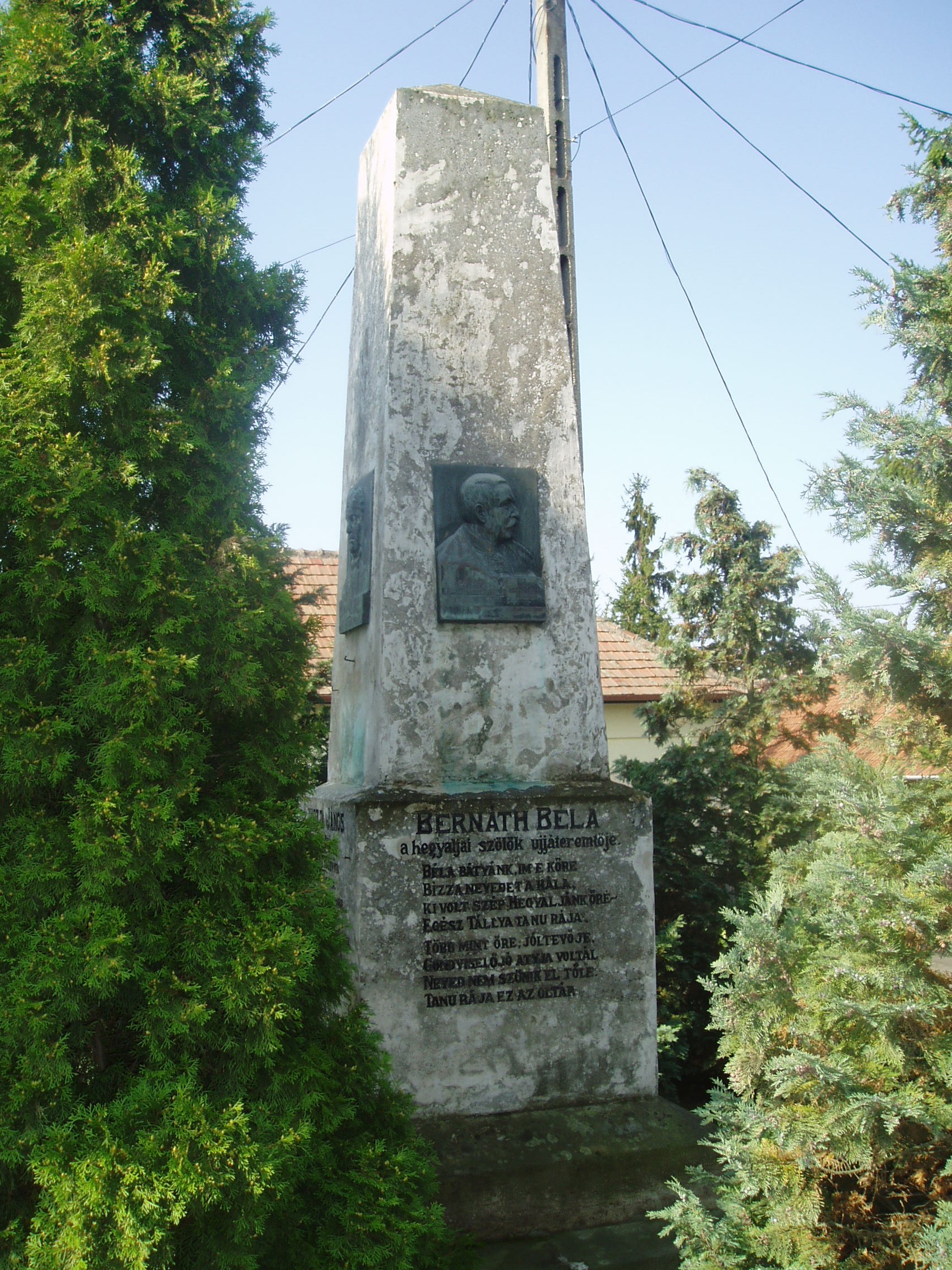 Nyilvános 1417 | 2004 | Tállya, Rákóczi utca 34. | Tállya központjában, a Polgármesteri Hivatal előtt egy 1922-ben felállított és 1994-ben felújított obeliszk látható. Három, a településsel kapcsolatba került híres személyiségnek állít emléket. Egy–egy oldalán Lavotta János, Bernáth Béla és Zempléni Árpád domborművű arcképét helyezték el, korabeli ízlésű méltató verssorokkal, a negyediken pedig a felállítás körülményeit rögzítették: Közadakozásból emelték tisztelőik és barátaik: Vikár Béla, Markó Miklós hírlapíró, Vaszari László szobrász, dr. Asztalos Kálmán, Kovács Ferenc 1922-ben. Lavotta János (1764–1820) a magyar zenetörténetben nagy szerepet játszott verbunkos triász egyik jeles tagja volt; Tállyán hunyt el (lásd: Tálly, Rákóczi u. 24.), s sírja is a helyi katolikus temetőben található (lásd: Tállya, Temető). Emlékszobája 2001. júliusában nyílt meg a Maillot–kastélyban (lásd: Tállya, Rákóczi u. 10.). Az 1878-ban született sátoraljaújhelyi főszolgabírót, Bernáth Bélát mint a hegyaljai szőlők újratelepítőjét tisztelik. A tállyai születésű Zempléni Árpád (1865–1919) — eredeti nevén Imrey Árpád — a maga korában jónevű költő volt; legnagyobb sikert aratott verseskötetének címét — Turáni dalok — is megörökítették domborművén. A fénykép 2007 augusztusában készült. Felh. irod.: Takács Péter: Tállya. Bp. Száz Magyar Falu Könyvesháza Kht., 2001. /Száz magyar falu könyvesháza/ Látnivalók Borsod-Abaúj-Zemplén megyében. Miskolc, Well-PRess, 2003 Dombóvári János: Pusztafedémestől Tállyáig. Miskolc, Szent Maximilian Kiadó, 1994 |
