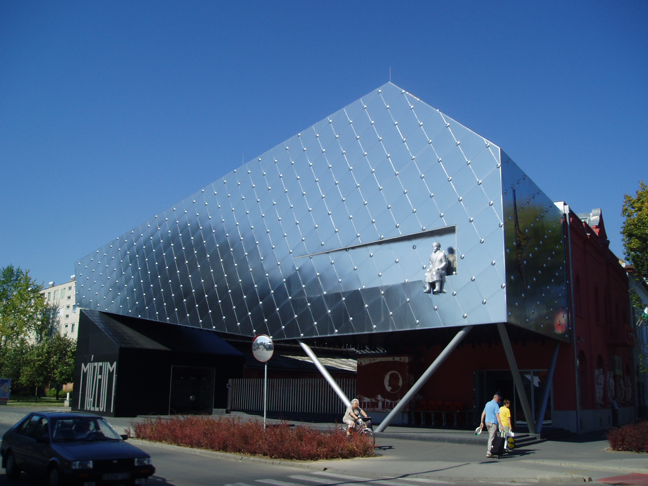 Nyilvános 1880 | 3761 | Rövid leírás | Teljes leírás (1.13 KB) | Hódmezővásárhely, Andrássy utca 34. EmlékPont Az EmlékPont - Fél évszázad Vásárhelyen Humán Oktatási Központ 2006-ban nyílt meg a fő utca egyik polgárházának átépítésével. Az intézmény Magyarországon elsőként egy konkrét város történetén keresztül mutatja be az 1945-1990 közti szocialista korszak történetét. Maga az épület vizuálisan is rendkívül érdekes. A homlokzatot egy egykori Lenin-szobor uralja, lábát lógatva groteszk hatást keltve. A korhű hangulat felidézéséhez több, a rendszerváltáskor "leváltott" szobrot is felhasználtak, de szinte abszurd elhelyezésben. A különleges tárlaton a legkorszerűbb kiállítási-, és múzeumpedagógiai eszközök segítségével elevenednek meg azok a történelmi folyamatok, amelyek Hódmezővásárhely és környéke lakóinak életét meghatározták ebben az időszakban. Az épületben kávéház, könyvesbolt és konferenciaterem is található. A fénykép 2007 júliusában készült. Felh. irod.: www.emlekpont.hu www.vendegvaro.hu |