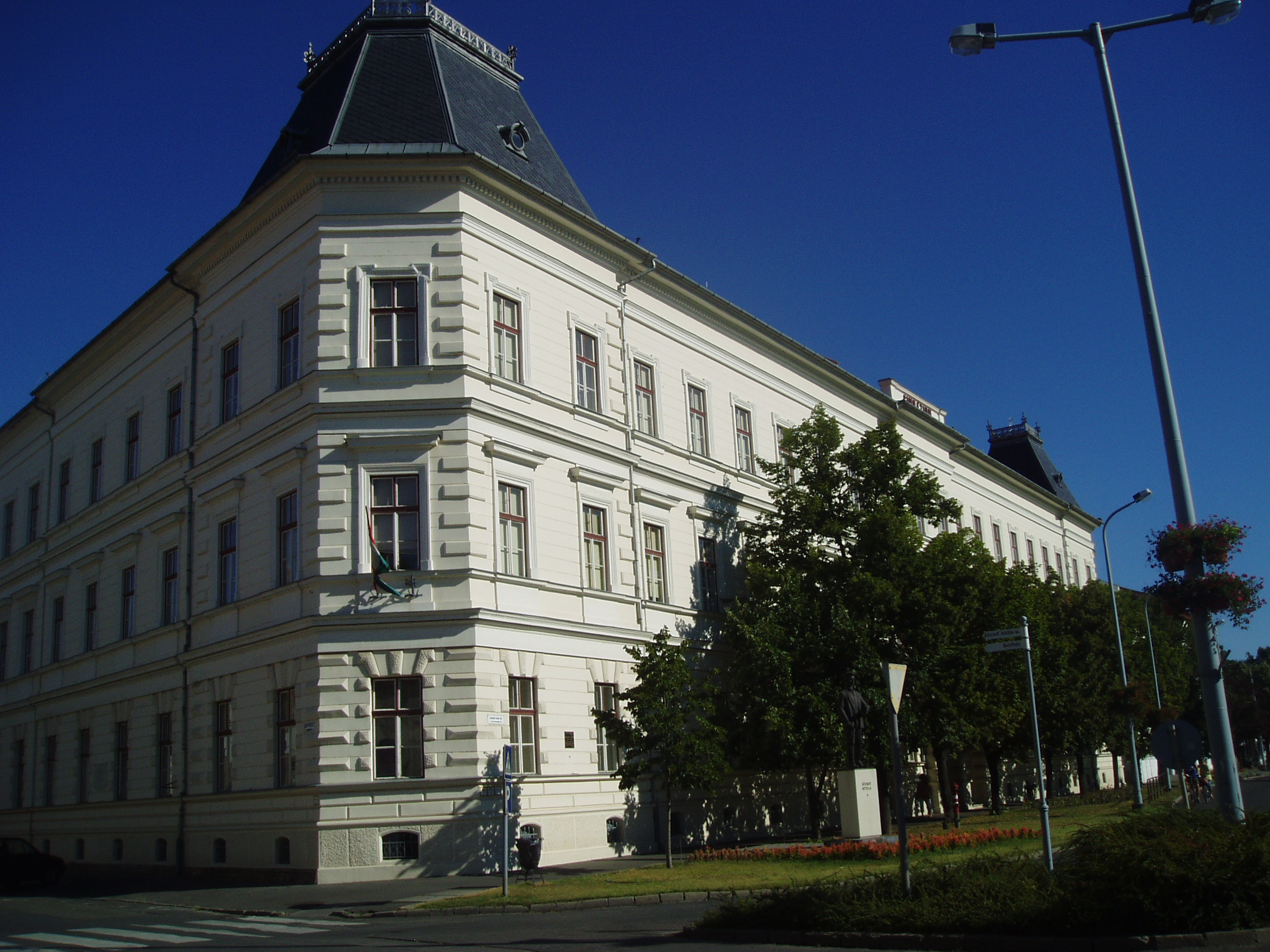 Nyilvános 1430 | 1890 | Makó, Csanád vezér tér 6. József Attila Gimnázium | A város központjából északra nyílik a sugárútszerű Csanád vezér tér. Nyugati oldalán áll a József Attila Gimnázium 1895-ben, eklektikus stílusban, Gerle Lajos tervei alapján emelt épülete. Itt tanított négy évig Juhász Gyula, itt tanult József Attila, majd Erdei Ferenc. A tizenöt és fél éves József Attila 1920 októberében érkezett Makóra. Verseire Juhász Gyula figyelt fel, akinek pártfogása révén a nyugat is közölt néhányat belőlük. Makói diák volt, amikor tizenhét éves korában Szegeden megjelent első verseskötete, a "Szépség koldusa", Juhász Gyula prófétikus előszavával: "A legnagyobb készséggel és örömmel vállalkoztam arra, hogy József Attila első verses könyvéhez előszót írjak. Ez a nagyon fiatal és nagyon tehetséges költő a legteljesebb mértékben megérdemli, hogy a figyelem feléje forduljon, hogy igaz szeretettel és reménységgel fogadja a magyar olvasóközönség és hogy a kritika se menjen el mellette közömbösen vagy ellenségesen és ne elégedjék meg vele szemben a nyomtatásban megjelenőknek rendesen kijáró vállveregetéssel. József Attila Isten kegyelméből való költő." Az épület előtt áll 2005-ben, születése centenáriumán újjáavatott szobra, a járdába ágyazottan pedig első verseskötetének bronzba öntött címlapja idézi emlékét. Egykor a gimnázium közvetlen közelében állott a Hollósy Kornélia Színház épülete. A színház lépcsőjén készült 1924. szeptember 18-án az a híres csoportkép, amelyen Juhász Gyula, Móra Ferenc és mások társaságában ott van József Attila is. Aznap a színházban három szegedi író, Juhász Gyula, Móra Ferenc és Réti Ödön egy-egy egyfelvonásosát mutatták be. A fénykép 2007 júliusában készült. Felh. irod.: Barangolások Csongrád megyében. Miskolc, Well-PRess, 1997 Nem én kiáltok. József Attila Szegeden. = www.sk-szeged.hu/kiallitas/jozsefattila |