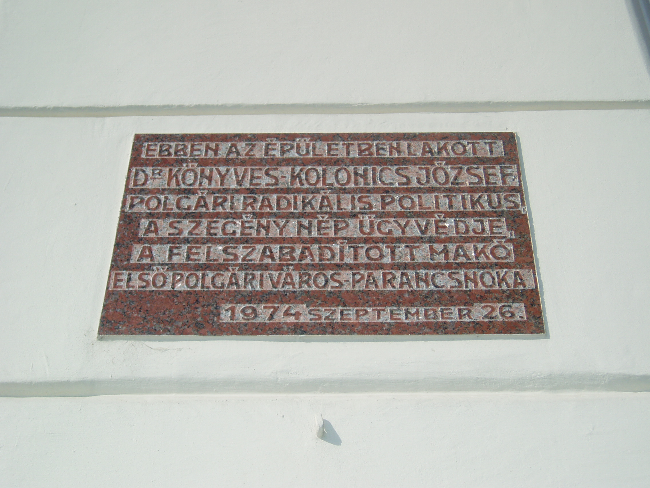 Nyilvános 1416 | 1882 | Makó, József Attila utca 2. | Ebben a házban lakott Könyves Kolonics József (1884-1955) polgári radikális politikus, a szegények ügyvédje, 1945 után Makó első polgári városparancsnoka. Emléktábláját születésnek 90. évfordulóján állították. A fénykép 2007 júliusában készült. |