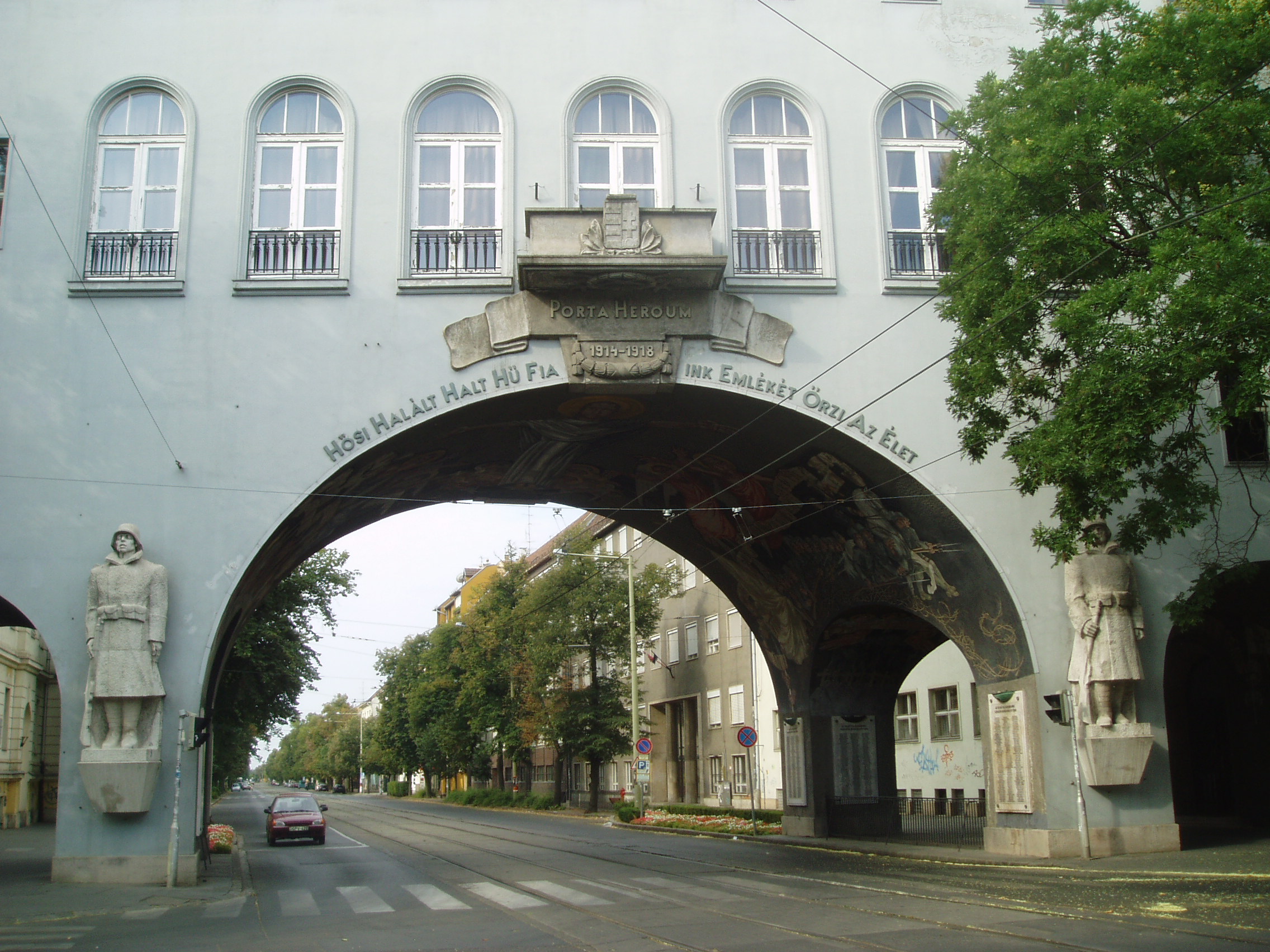 Nyilvános 1438 | 3711 | Szeged, Aradi vértanúk tere: Hősök kapuja | Az Aradi vértanúk tere déli oldalát a nagyszabású Hősök kapuja (Porta heroum) határolja. Az 1936-ban Pogány Móric tervei szerint épült kapu épült kapu honvédszobrai - az élő és a halott katona - Lőte Éva 1937-ben készült alkotásai, s az I. világháború áldozataira emlékeztetnek. A boltív freskóit Aba-Novák Vilmos készítette. A festményeket 1949-ben levakolták, csak a Millenniumra sikerült feltárni és helyreállítani őket. A művész a képsorozaton három témát jelenített meg: a háborús emlékezést, a hősi halottak dicsőítését és Horthy Miklós elindulását Szegedről. Középen, fejjel a tér felé Aba-Novák az ítélkező Krisztus mintegy 8 méteres alakját ábrázolta, lábainál a harsonás, ítélkező angyalok csoportjával. A kapu alatt kezdődik a nagyállomásra vezető Boldogasszony sugárút. A fénykép 2007 júliusában készült. Felh. irod.: www.vendegvaro.hu |