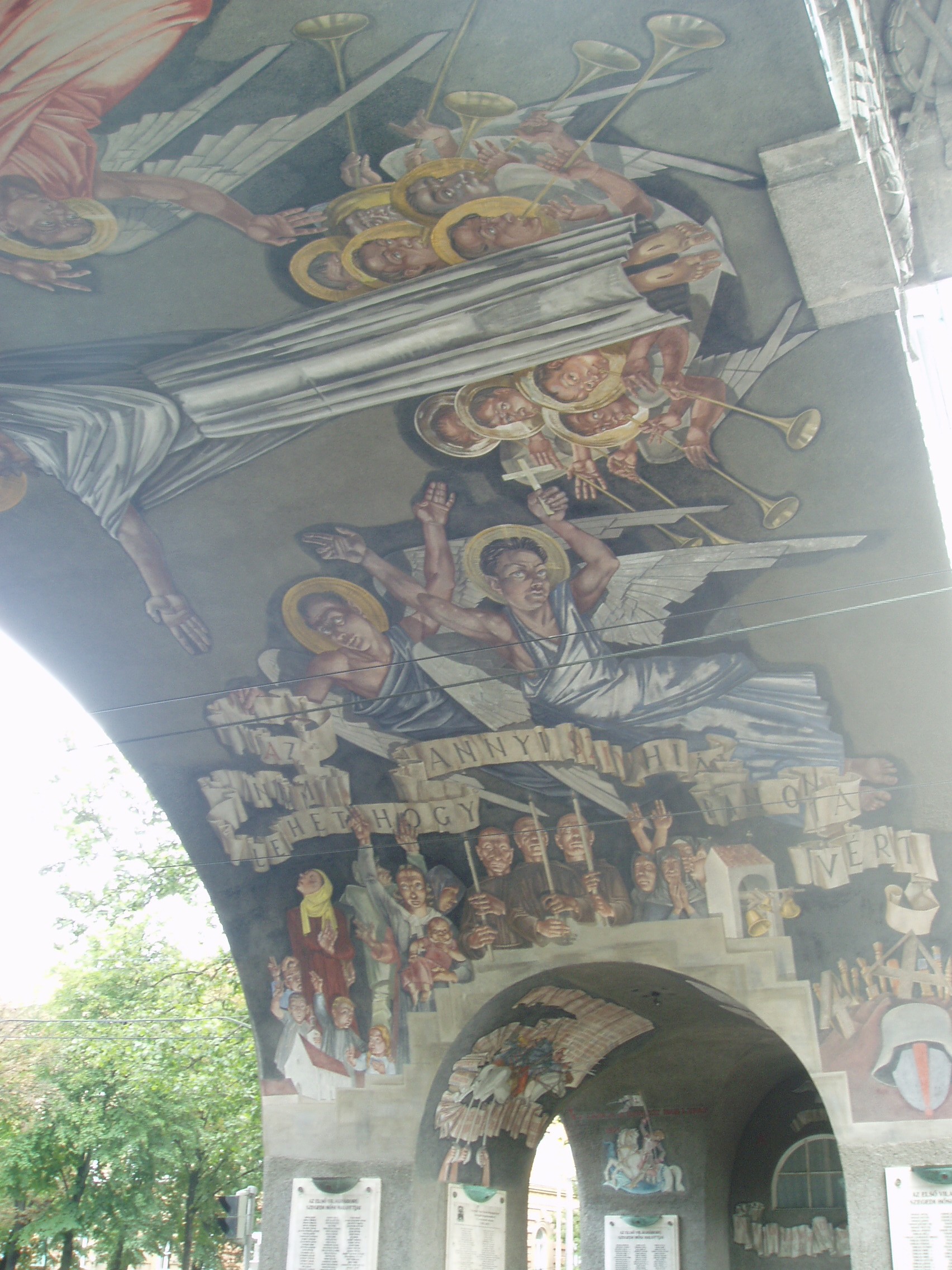 Nyilvános 1389 | 1866 | Szeged, Aradi vértanúk tere: Hősök kapuja | Az Aradi vértanúk tere déli oldalát a nagyszabású Hősök kapuja (Porta heroum) határolja. Az 1936-ban Pogány Móric tervei szerint épült kapu épült kapu honvédszobrai - az élő és a halott katona - Lőte Éva 1937-ben készült alkotásai, s az I. világháború áldozataira emlékeztetnek. A boltív freskóit Aba-Novák Vilmos készítette. A festményeket 1949-ben levakolták, csak a Millenniumra sikerült feltárni és helyreállítani őket. A művész a képsorozaton három témát jelenített meg: a háborús emlékezést, a hősi halottak dicsőítését és Horthy Miklós elindulását Szegedről. Középen, fejjel a tér felé Aba-Novák az ítélkező Krisztus mintegy 8 méteres alakját ábrázolta, lábainál a harsonás, ítélkező angyalok csoportjával. A kapu alatt kezdődik a nagyállomásra vezető Boldogasszony sugárút. A fénykép 2007 júliusában készült. Felh. irod.: www.vendegvaro.hu |