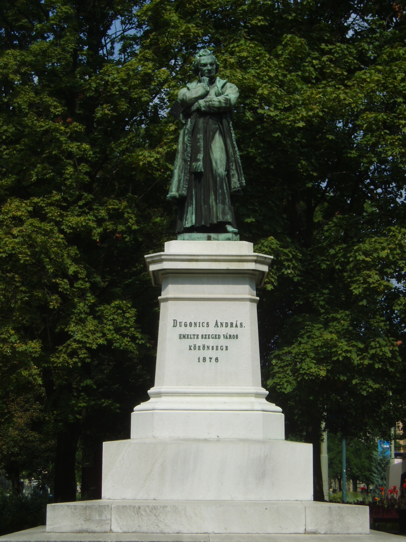 Nyilvános 1371 | 2282 | Szeged, Dugonics tér: Dugonics András szobra | A térnek is nevet adó Dugonics András (1740–1818) kegyesrendi tanár, író szobrát 1876. augusztus 19-én, a Szegeden megtartott Országos Dalosverseny alkalmából avatták fel. Felállításához több koncertje jövedelmével Reményi Ede is hozzájárult. Elkészítésére eredetileg Izsó Miklós kapott megbízást. El is készítette a szobor kismintáját, azonban 1875 májusában bekövetkezett halála miatt munkáját tanítványa, Huszár Adolf folytatta és fejezte be. Az ünnepségen az összkar élén a téren ez alkalomra emelt óriási dalcsarnokban Erkel Ferenc vezényelte a Himnuszt. Ez a dalosünnep volt az árvíz előtti Szeged utolsó nagy ünnepe. A szobor eredetileg a főreáliskola (lásd: Szeged, Dugonics tér 13.) előtt állott. Azonban amikor ennek épületébe a királyi ítélőtábla költözött be, a tábla akkori elnökének — kálvinista lévén — nem tetszett, hogy hivatala előtt „pápista” pap szobra áll, s a városi közgyűlésben keresztülvitte, hogy a szobrot áthelyezzék. 1895. május 15-én lebontották és június 13-án újra felállították mai helyén, a tér közepén. Megfordították, s most arra az épületre tekint, amelynek húsz évig hátat fordított. A hirtelen szoboráthelyezés nyomán keletkezett a jeles szegedi mondás: „Möglépött, mint Dugonics.” A fénykép 2007 júliusában készült. Felh. irod.: Péter László: Szeged. Bp. Panoráma, 1981 Tóth Attila: Szeged szobrai és muráliái. Szeged, 1993 |