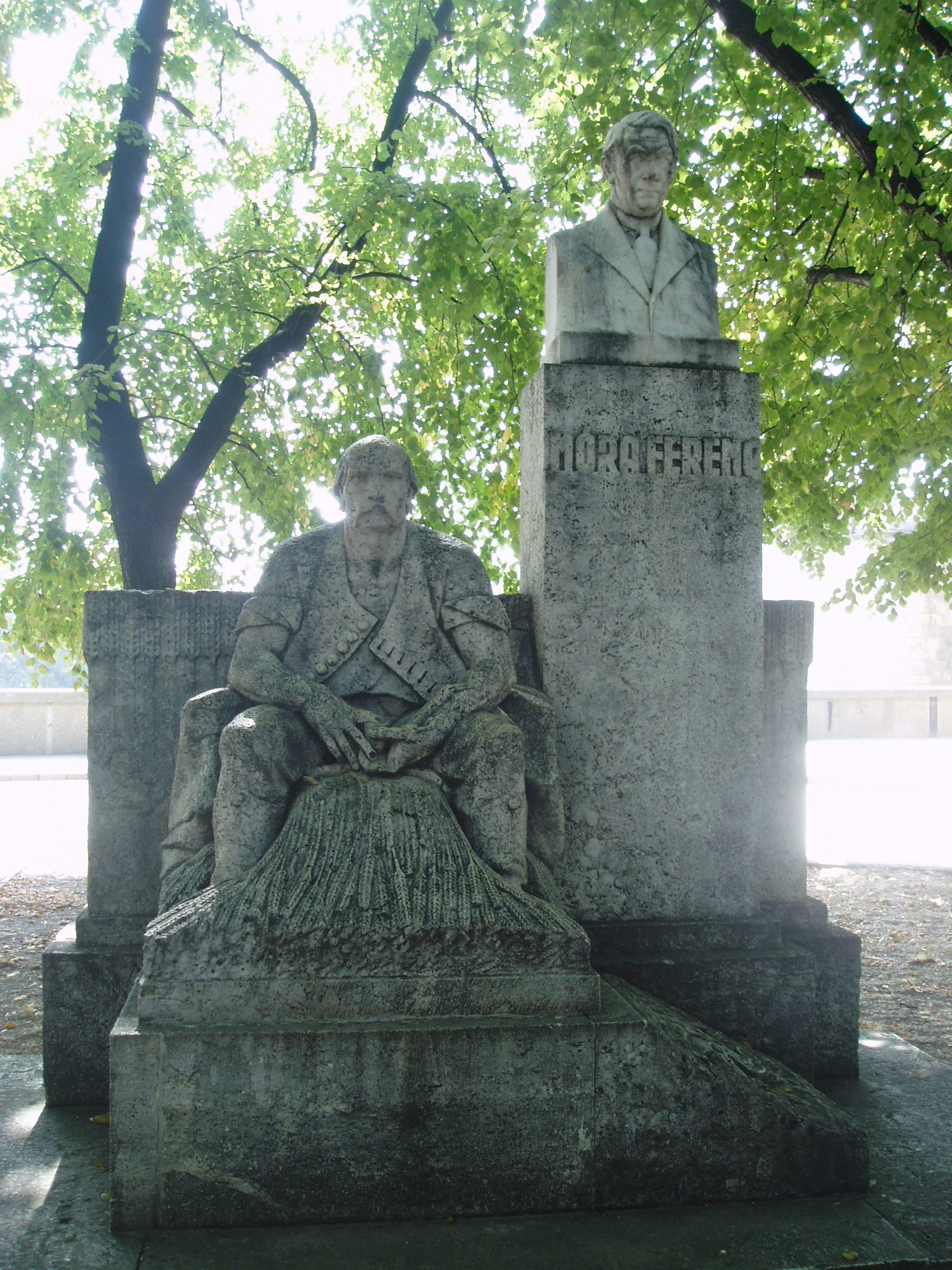 Nyilvános 1432 | 2164 | Szeged, Roosevelt tér: Móra Ferenc emlékműve | A Roosevelt téren, a Közművelődési palota mellett áll Móra Ferenc emlékműve, Tápai Antal 1943-ban felavatott alkotása. Az emlékmű hangsúlyos mellékalakja Mátyás, Móra "Ének a búzamezőkről" című regényének főhőse. Móra Ferenc (1879-1934)1904-ben lett segédkönyvtáros az akkor még egy szervezeti kötelékbe tartozó és a Közművelődési palotában működő Somogyi Könyvtár és Városi Múzeumban. Az ásatásokba először 1905-ben kóstolt bele, amikor az akkori igazgató, Tömörkény István maga helyett kiküldte a közeli Röszkére avar sírok feltárására. Móra 1907-1914 között a Zentával átellenben lévő csókai Kremenyákon ásott, ahol közel 7000 m2 területen népvándorlás kori telepek és sírok mellett teljesen feltárt egy újkőkori települést is. Ásatásának eredményeire felfigyelt az európai régészet, és Gordon Child, a neves brit régész is Szegedre jött a leletek tanulmányozására. 1907-1934 között Csongrád vármegyében közel száz lelőhelyen ásatott, de Torontál, Csanád, Pest-Pilis-Solt-Kiskun és Békés megyék területére is elkalandozott. 1917-ben az intézmény igazgatója lett, ezen a poszton működött haláláig. Múzeumi tapasztalatait szépirodalmi műveiben is kamatoztatta. A fénykép 2007 júliusában készült. Felh. irod.: www.mfm.u-szeged.hu/index.php?id=kiallitas-mora http://est.hu/cikk/32014/mora_ferenc_muzeum |