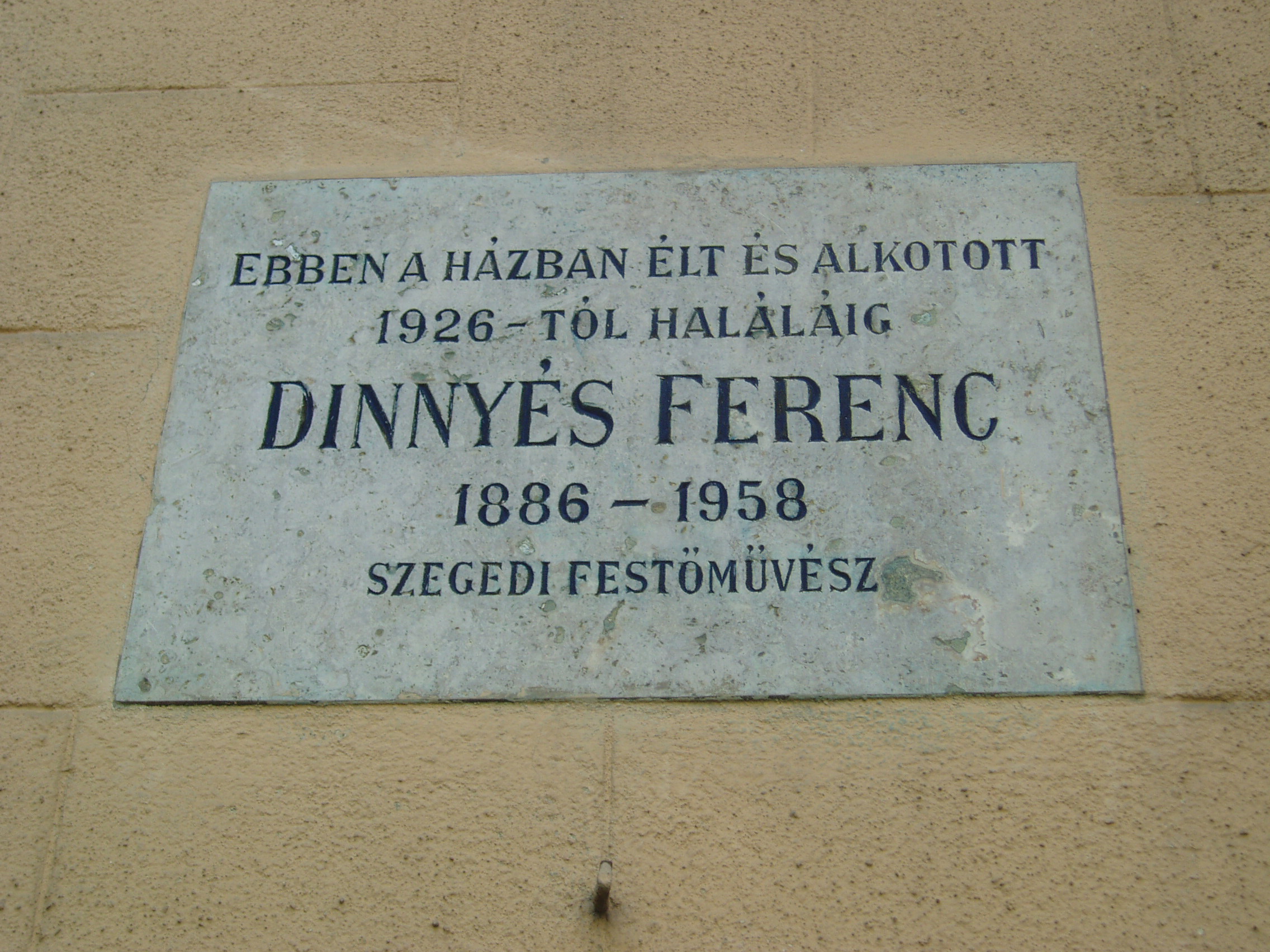Nyilvános 1436 | 1863 | Szeged, Szentháromság utca 4. | Ez az 1926-ban épült városi bérház volt az utca első háromemeletes épülete. Mint a homlokzatán elhelyezett emléktáblán is olvasható, ebben a házban élt és alkotott 1926 és 1958 között Dinnyés Lajos (1886-1958) szegedi festőművész. Ugyanitt lakott 1930-tól deportálásáig Vér György (1904-1944), a Délmagyarország publicistája, Juhász Gyula és Móra Ferenc baráti körének fiatal tagja. Itt élt és alkotott Buday György neves grafikusművész is. A fénykép 2007 júliusában készült. Felh. irod.: Péter László: Szeged. Bp. Panoráma, 1981 |