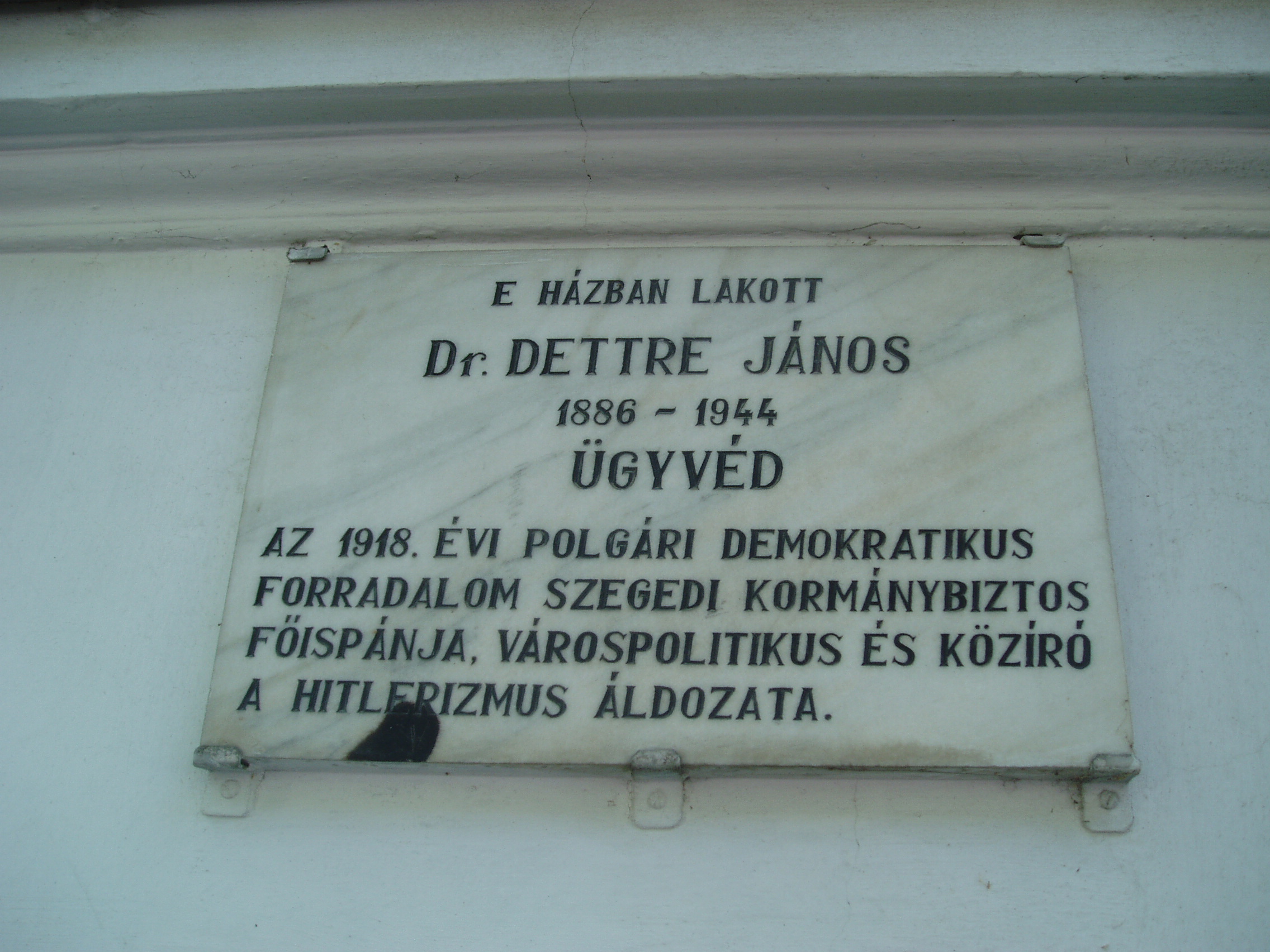 Nyilvános 1372 | 1801 | Szeged, Takaréktár utca 5. | Ebben a házban lakott Detre János (1886-1944) ügyvéd, várospolitikus és közíró. Az őszirózsás forradalom idején előbb a Szegedi Nemzeti Tanács titkára volt, majd Károlyi Mihály kormánya kinevezte Szeged kormánybiztos-főispánjává. Közvetítő, kiegyensúlyozó szerepet igyekezett játszani a bal- és jobboldal, a munkásság és a polgárság, valamint a Város és a franciák között. Szerepe volt benne, hogy Szegeden viszonylag csendesen, súlyosabb kilengések nélkül zajlottak le a forradalmi események. 1920-ban Szabadkára emigrált, ahol a Bácsmegyei Napló munkatársa lett. 1925-ben visszatért Szegedre, ahol a Délmagyarország publicistájaként dolgozott. 1944-ben felesége, Eisenstein Ilona deportálását követően önként vetett véget életének. A fénykép 2007 júliusában készült. Felh. irod.: Lengyel András: Író és "rendszerváltás". Dettre János és Móra Ferenc konfliktusa. = www.sulinet.hu/oroksegtar/data/Muzeumi_kotetek/Csongrad_megye |