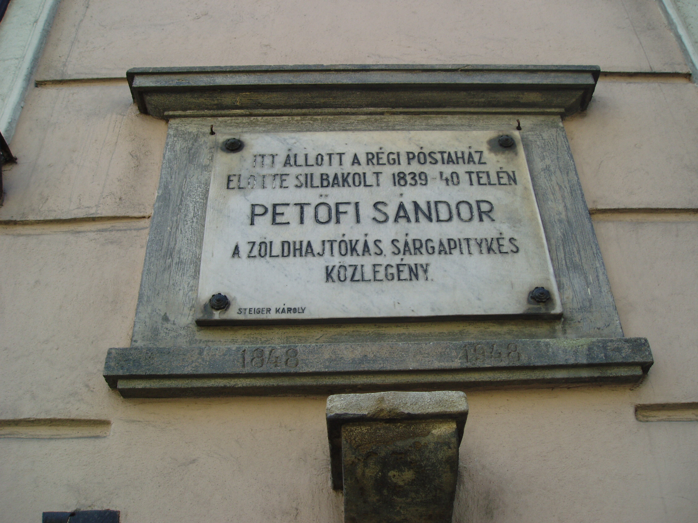 Nyilvános 1460 | 2165 | Sopron, Széchenyi tér 14. | Az épületen Petőfi Sándor emléktáblája olvasható azon a helyen, ahol a régi postaház előtt katona korában őrségben szokott állni. Petőfi 1839. szeptember 6-án hirtelen elhatározással belépett a báró goldnerfalvi Gollner Alajos tulajdonában lévő gyalogezredbe, és hat évi szerződést írt alá. A költő a zöldhajtókás, sárga pitykés, frakkszabású egyenruhát rövid ideig hordta. Betegsége miatt 1841. februárban felmentették a szolgálat alól, és obsittal elbocsátották, majd 1841. március elején elhagyta a várost. Ma e hely közelében szobra is áll. A fénykép 2006 áprilisában készült. Felh. irod.: Czellár Katalin: Sopron. Bp. Panoráma, 1988 |