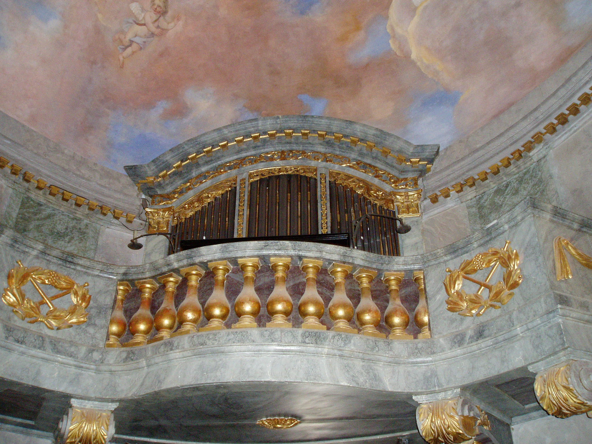 Nyilvános 1514 | 3349 | Nagycenk, Mauzóleum: orgonakarzat | A Széchényi család nyughelyét a temető létesítésével egyidőben Széchényi Ferenc építtette 1778-ban. A barokk stílusú sírkápolnát 1806-10 között klasszicista előtérrel bővítették. A téglalap alakú előcsarnok kazettás mennyezetét ion oszlopok tartják. Az ovális alaprajzú kápolnát kupola fedi, több kutató véleménye szerint Dorffmeister István freskóival. Innen jutunk a kriptába, a család számos jeles tagjának végső nyughelyére. A fénykép 2005 júliusában készült. Felh. irod.: Látnivalók Győr-Moson-Sopron megyében. Miskolc, Well-PRess, 2000 |