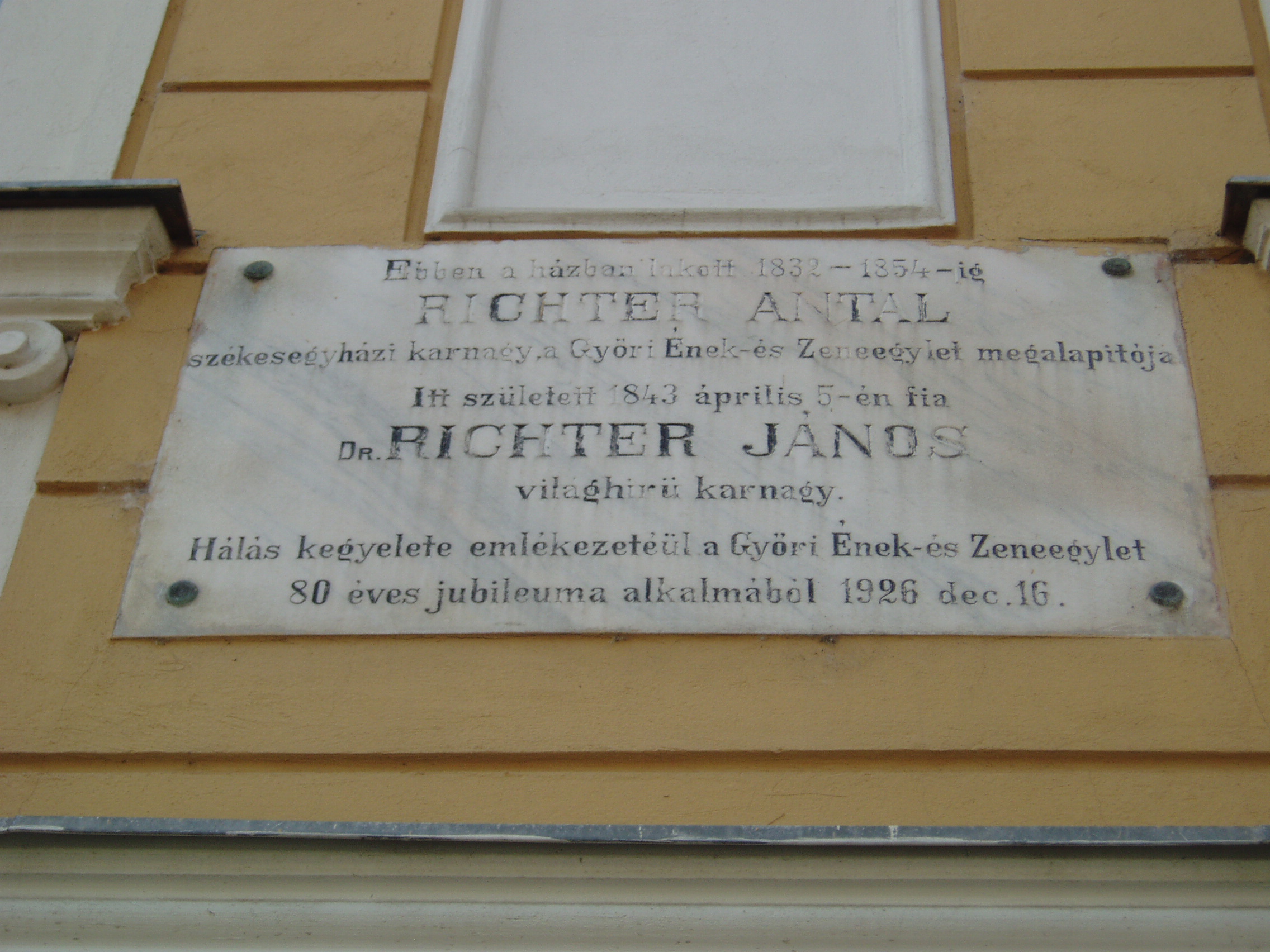 Nyilvános 1533 | 2015 | Győr, Apáca utca 5. Káptalani zenészek háza | A XVI. század első felében ezen a telken a városháza állott. Abban rendezték be a a székeskáptalan által fenntartott XVI–XVII. századi „magyar iskolát”, amelyet káptalandombi otthonából a német katonaság üldözött el. Az ekkor már kétemeletes épület az iskola mellett a székesegyházi (lásd: Győr, Káptalandomb: Székesegyház) muzsikusoknak is otthona lett, mint a Káptalani zenészek háza. Lakott benne Istvánffy Benedek, aki 1778 előtt működött a székesegyház zenei vezetőjeként, majd 1832 és 1854 között itt lakott Richter Antal. Felesége, Csazenszky Jozefa nagyszerű énekesnő volt. 1843. április 4-én ebben a házban született fiuk, Richter János (Hans Richter), a későbbi legendás Wagner–karmester. Apa és fia közös emléktábláját a Richter Antal által 1846-ban alapított Férfidalegylet 80. évfordulóján — 1927 februárjában — állították. 2008-ban a Richterek és Győr zenei hagyatékának ápolására megnyílt a Richter János Archívum (lásd: Káptalandomb 5/A). A felvétel 2008 május végén készült. Felh. irod.: Cziglényi László: Győr. Bp. Panoráma, 1981 Orbánné Horváth Márta: Emlékművek, emléktáblák győri kislexikona. Győr, Városi Könyvtár, 2001 Vavrinecz Veronika: Richter Antal (1802–1854) élete és működése. 2003, Szkarabeusz Kiadó |