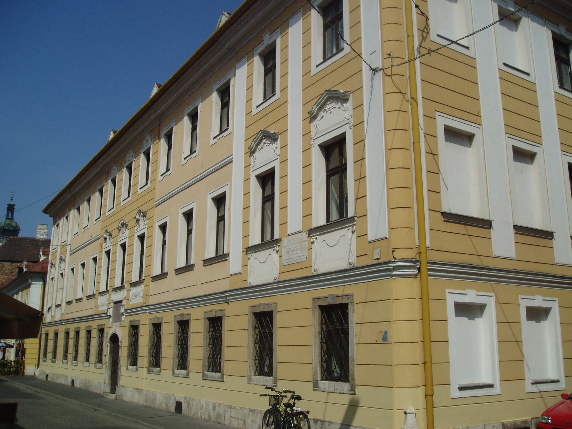 Nyilvános 1551 | 2169 | Győr, Apáca utca 5. Káptalani zenészek háza | A XVI. század első felében ezen a telken a városháza állott. Abban rendezték be a a székeskáptalan által fenntartott XVI–XVII. századi „magyar iskolát”, amelyet káptalandombi otthonából a német katonaság üldözött el. Az ekkor már kétemeletes épület az iskola mellett a székesegyházi (lásd: Győr, Káptalandomb: Székesegyház) muzsikusoknak is otthona lett, mint a Káptalani zenészek háza. Lakott benne Istvánffy Benedek, aki 1778 előtt működött a székesegyház zenei vezetőjeként, majd 1832 és 1854 között itt lakott Richter Antal. Felesége nagyszerű énekesnő volt. 1843. április 4-én ebben a házban született fiuk, Richter János (Hans Richter), a későbbi legendás Wagner–karmester. A felvétel 2008 május végén készült. Felh. irod.: Cziglényi László: Győr. Bp. Panoráma, 1981 Orbánné Horváth Márta: Emlékművek, emléktáblák győri kislexikona. Győr, Városi Könyvtár, 2001 Vavrinecz Veronika: Richter Antal (1802–1854) élete és működése. 2003, Szkarabeusz Kiadó |
