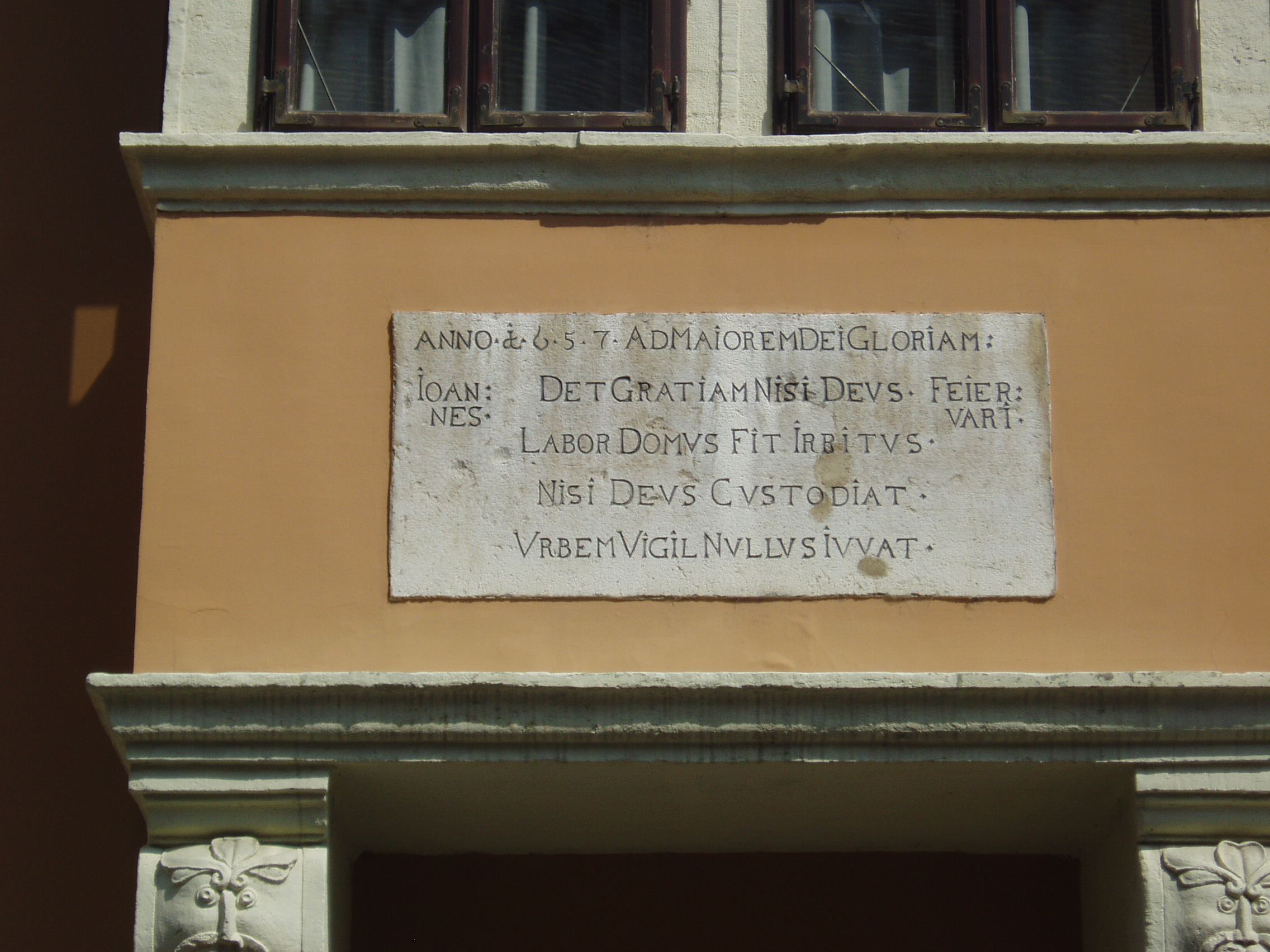 Nyilvános 1499 | 2000 | Győr, Apáca utca 9. Fejérvári-ház | Győr egyik legpatinásabb épületét 1657-ben emelték, amint a homlokzatán elhelyezett latin nyelvű emléktáblán is olvasható, majd 1770 körül átalakították. A későreneszánsz-korabarokk ház kapujának zárókövén a Fejérvári család címere, egy csőrében patkót tartó vadliba látható. Első emeleti zárt erkélye maszkban végződő csigavonalas konzolokon nyugszik. A felvétel 2008 május végén készült. Felh. irod.: Cziglényi László: Győr. Bp. Panoráma, 1981 |