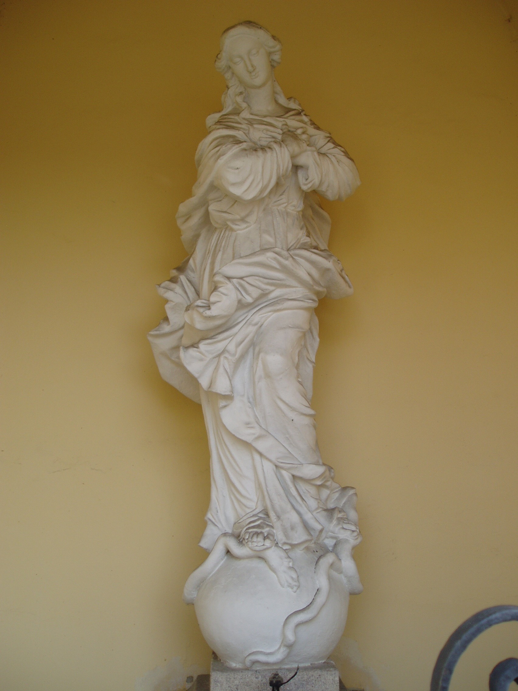 Nyilvános 1474 | 1927 | Győr, Bécsi kapu tér: Karmelita templom | A templomból a főkapun kijövet balról, egy régi oltárfülkében áll a Hab Mária-szobor, amely hozzáértők szerint Győr legszebb barokk szoboralkotása. Eredetileg a Rába szigetén állott árvízi emlékként. A XVII. század közepe óta ismert szobor alkotójának Giovanni Giulianit tartják. A felvétel 2008 május végén készült. Felh. irod.: Cziglényi László: Győr. Bp. Panoráma, 1981 |