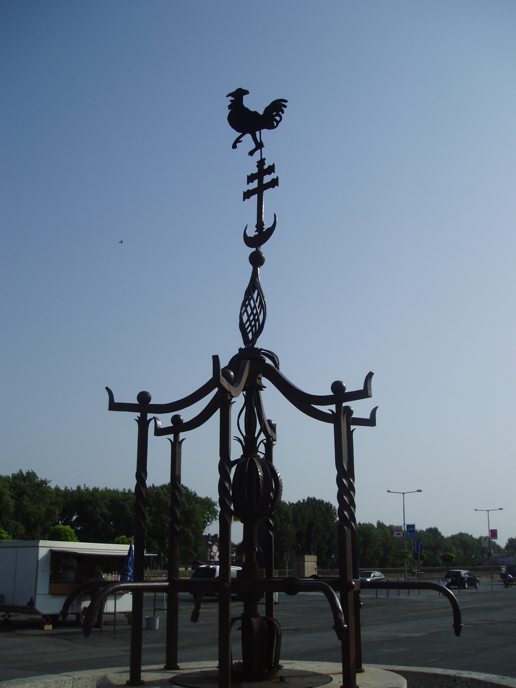 Nyilvános 1514 | 4422 | Győr, Dunakapu tér: Vaskakas | A Dunakapu tér közepe táján lévő díszkút tetejét a győri vaskakas másolata őrzi. A város jelképének is tartott madár eredeti példánya, amely ma a múzeumban látható, voltaképpen egy vörösréz lemezből kivágott szélkakas, amely a már nem létező Dunakapu építményét koronázta. Hozzá Győr várának a töröktől való 1598-as visszafoglalásához kapcsolódó legenda fűződik, amelynek forrása egy korabeli, Bécsben megjelent népének. E szerint a török dölyfösségében a Vízi-kapura aranyozott kakast helyezett el, és azt mondta, akkor űzik ki őket Győrből, amikor ez a kakas kukorékolni fog. A hagyomány szerint a vár visszafoglalásakor az érckakas az erős szélviharban valóban megszólalt... A felvétel 2008 május végén készült. Felh. irod.: Cziglényi László: Győr. Bp. Panoráma, 1981 |