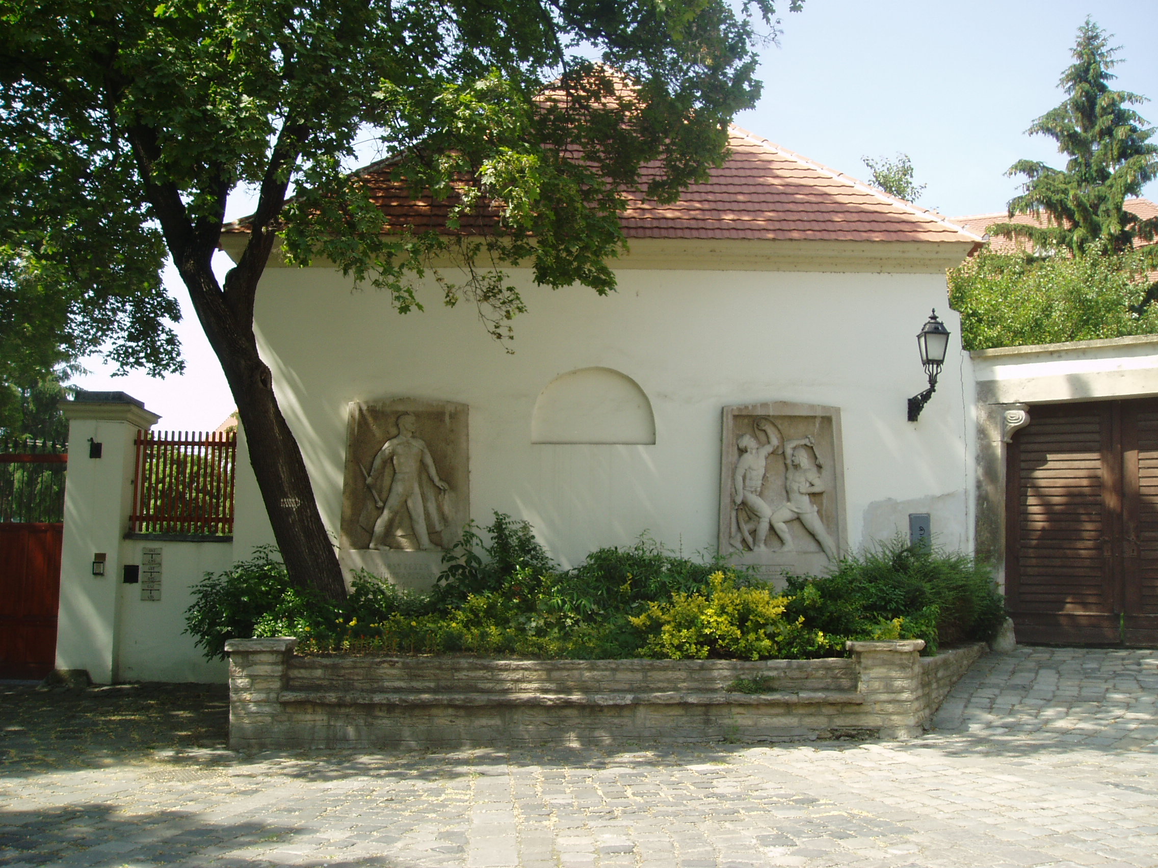 Nyilvános 1471 | 1975 | Győr, Káptalandomb: Eörsy Péter és Pálffy Miklós emlékművei | A Püspökvár előtti kis házon - sajnos, házszámot nem visel - Győr két hősét jelenítik meg Nagy Sándor domborművei. Pálffy Miklós és Eörsy Péter a török elleni küzdelem szereplői voltak. Miután 1594-ben Szinán pasa elfoglalta Győrt, 1598. március 29-én Pálffy Miklós komáromi főkapitány, a kor egyik legkiválóbb magyar hadvezére és Schwarzenberg Adolf, a bécsi várőrség parancsnoka egy akkor még kevéssé ismert harci eszköz, a petárda segítségével a déli, ún. Fehérvári-kaput berobbantotta és másfél napos harc után Győrt visszafoglalta. Eörsy Miklós szintén tevékeny szerepet játszott az eseményekben. A szegénység és a névtelenség sorából került ki, és maga küzdötte föl magát a nemesi rend legendás hősévé. Sok hadakozása mellett a legvéresebb harca a törökkel Győrött volt 1598-ban, ahol ezer vízi és szárazföldi hajdú élén küzdött. A felvétel 2008 május végén készült. |