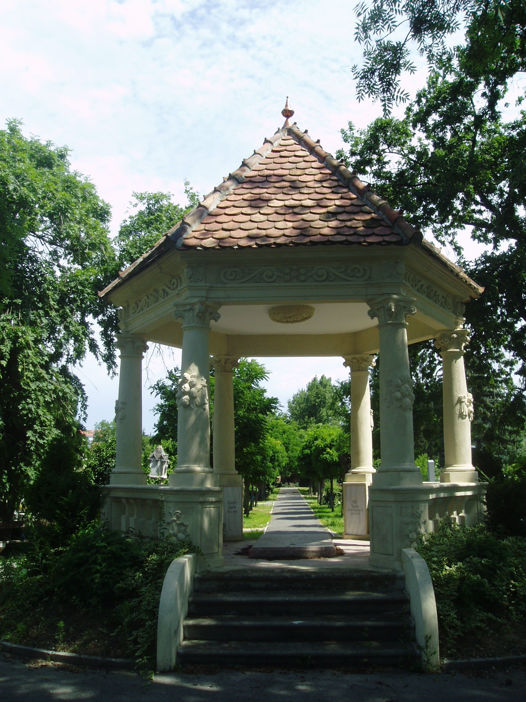 Nyilvános 1460 | 2156 | Sopron, Balfi út. Evangélikus temető. Gálffy Ádám sírboltja | A soproni evangélikusok 1674-ben nyitották meg temetőjüket, korábban a katolikusokkal együtt a Szent Mihály temetőbe temetkeztek. Az 1686-ban elhunyt Gálffy Ádám mellett ide temették az evangélikus egyház nevesebb lelkészeit is: a történetíró Gamauf Teofilt és Kis János költőt. A sírbolt egy hatszögletes, nyitott csarnok, amelyet kőkorlát szegélyez, ezen oszlopok emelkednek. Az építményt cseréptető fedi. Padlójában,amelyhez néhány lépcsőfok vezet, Gálffy epitáfiuma látható. Gálffy Ádám gazdag soproni polgár, földbirtokos, kereskedő volt, aki nagyértékű kegyszergyűjteményt ajándékozott az evangélikus gyülekezetnek. A fénykép 2008 júniusában készült. Felh. irod.: Czellár Katalin: Sopron. 3. jav. kiad. Bp. Panoráma, 2000 |