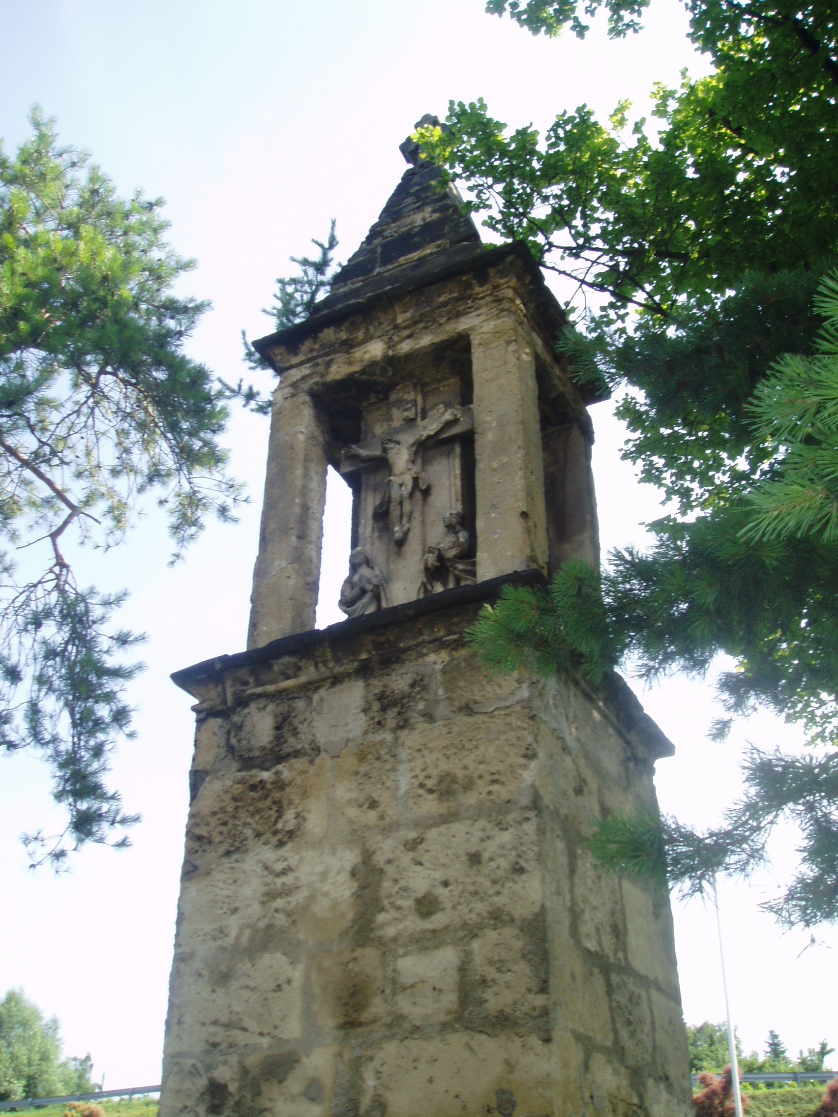 Nyilvános 1456 | 2189 | Sopron, Bécsi út 38. után: Fehér kereszt | A Fehér- vagy Máriacelli kereszt í Bécsi út és a Bástya utca sarkán áll, közel a kínai kalapos házhoz (lásd: Sopron, Bástya utca vége). Az 1670-es években készült késő gótikus stílusban, de 1910-ben erősen átalakították. Nevét szürkésfehér színéről kapta, illetve arról, hogy valaha itt gyülekeztek a Máriacellbe tartó zarándokok. Magas talapzaton áll a szögletes nyílású tabernákulum, benne feszület Máriával és Szent Jánossal. Az építményt magas kősisak koronázza, kereszttel. A fénykép 2008 júniusában készült. Felh. irod.: Czellár Katalin: Sopron. 3. jav. kiad. Bp. Panoráma, 2000 |