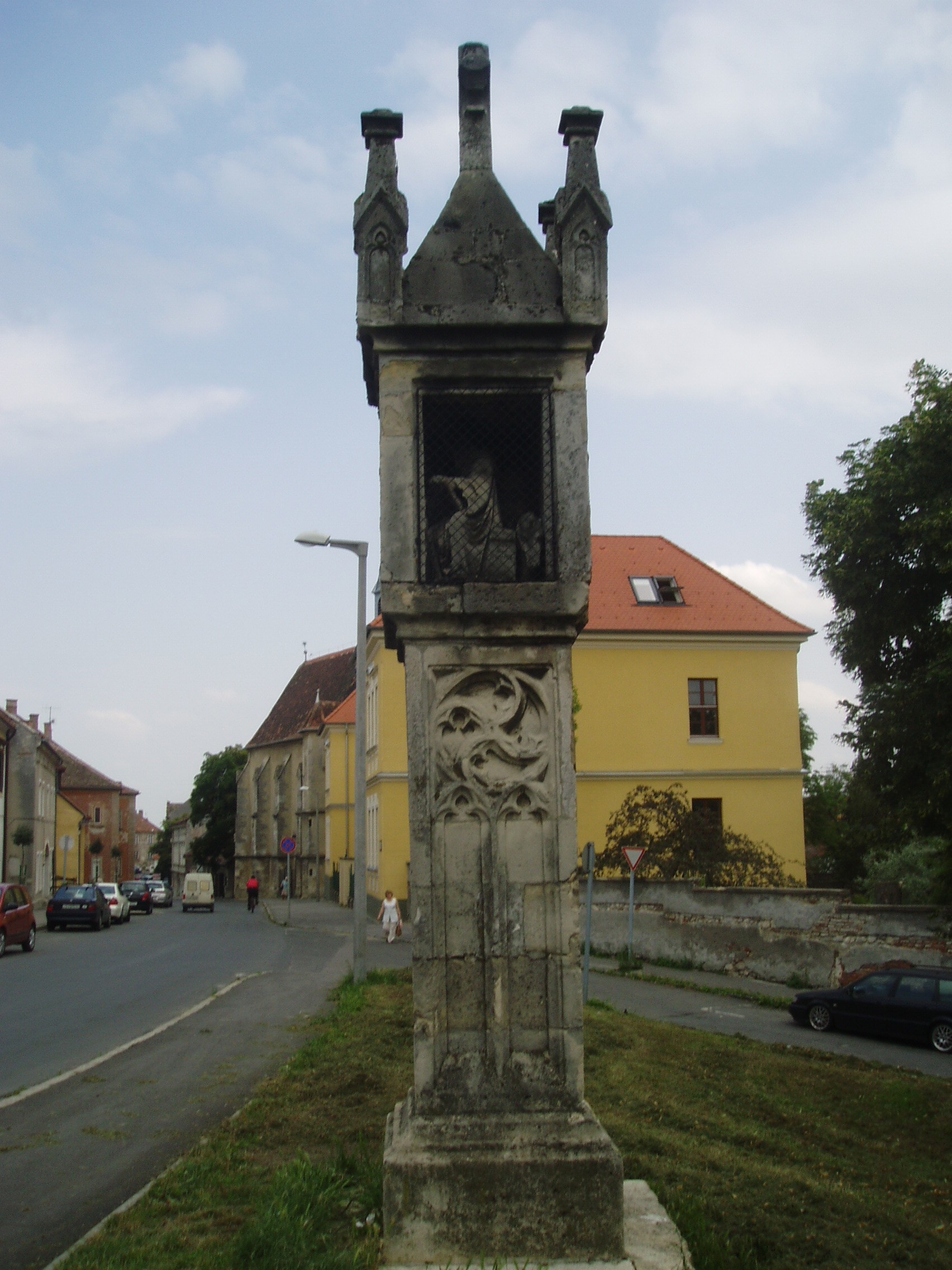 Nyilvános 1435 | 2597 | Sopron, Bécsi út: Lénárt-kereszt | A középkori eredetű, gótikus alkotás a Bécsi út és a Szélmalom utca sarkán áll. A XV. században készült, s akkor a Pócsi kapu közelében állt, a városfal mellett. Innen 1885-ben a Kuruc-domb aljába került, mostani helyére az 1930-as években hozták. Széles talapzaton álló, kőráccsal díszített magas pilléren szögletes tabernákulum áll, benne Szent Lénárt szobra. Kősisakjának fiatornyai és keresztje neeogótikus. A fénykép 2008 júniusában készült. Felh. irod.: Czellár Katalin: Sopron. 3. jav. kiad. Bp. Panoráma, 2000 |