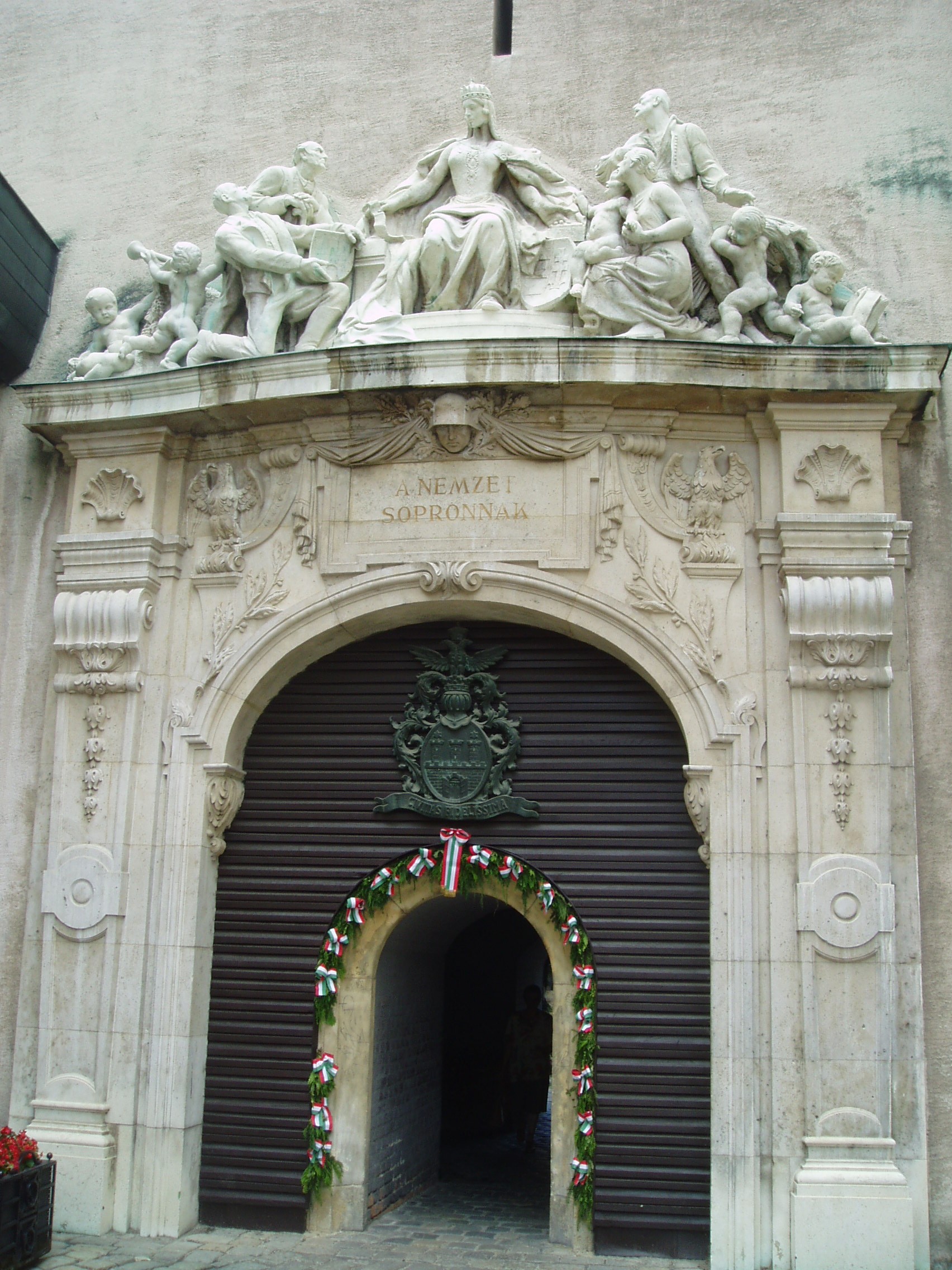 Nyilvános 1446 | 2139 | Sopron, Előkapu: Tűztorony | Sopron jelképe a város messzire ellátszó, legmagasabb építménye. Első írásos említése 1409-ből való. Magassága akkor körülbelül a mai loggiáig terjedt, ahol akkor is erkély volt. 1676-ban leégett, és csak 1681-ben építették újjá. A XIX.század végén az új városháza építésekor csaknem lebontották. 1928-ban átjárója köré és fölé a nemzet ajándékaként Kisfaludi Strobl Zsigmond és Hikisch Rezső népszavazási emlékműve került. Évszázadokon át a szabad királyi városokra jellemző toronyzene helyszíne volt. A kép 2008 júniusában készült. Felh. irod.: Czellár Katalin: Sopron. 3. jav. kiad. Bp. Panoráma, 2000 |