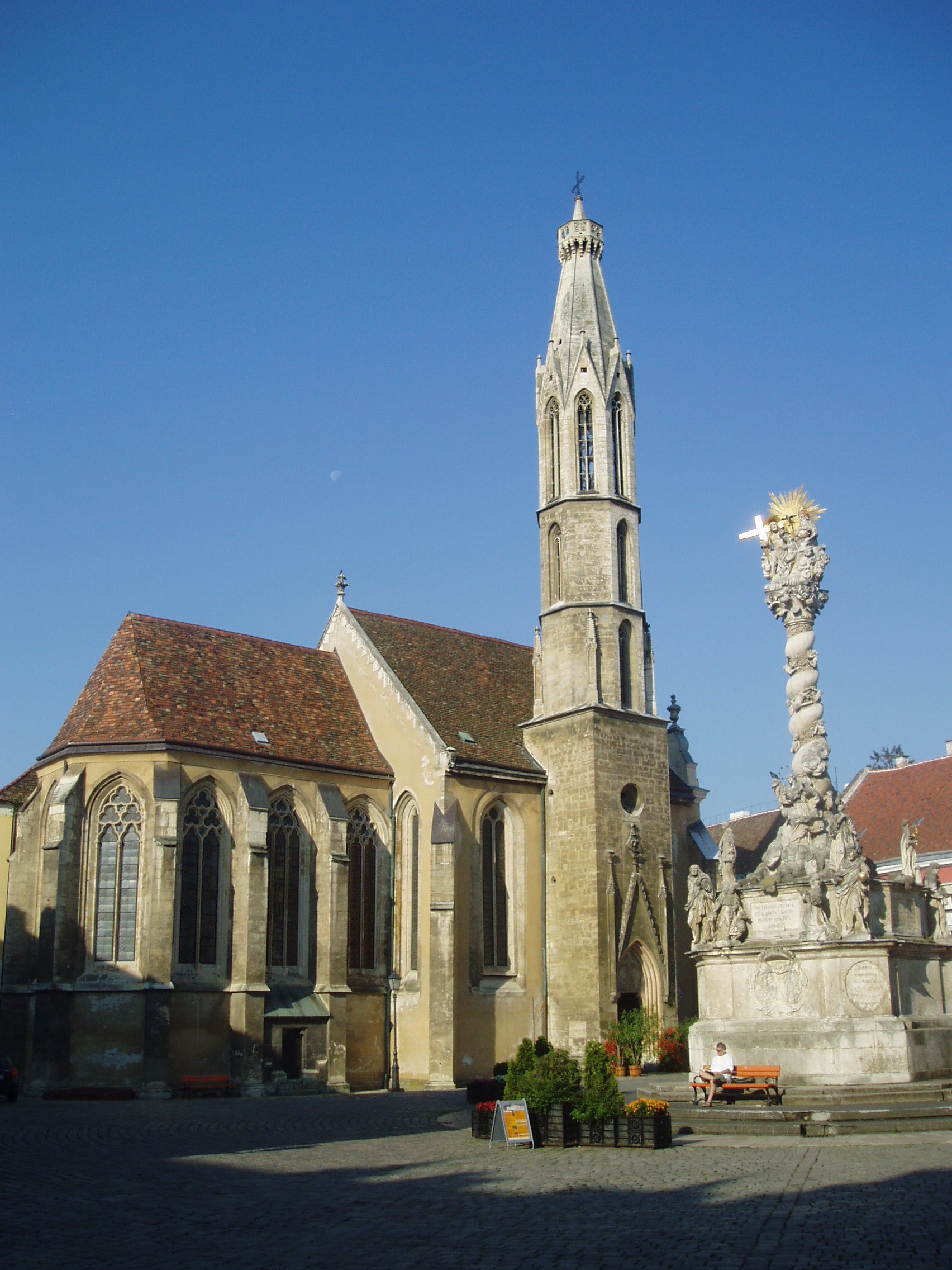 Nyilvános 1336 | 1766 | Sopron, Fő tér: Kecske-templom | A soproni Fő tér ékességét, a gótikus Kecske–templomot és a hozzá tartozó ferences kolostort a XIII. század második felében kezdték építeni. Tornya a XIV. század első negyedében készült el; mai alakja id. Storno Ferenc 1888–1894 között végzett helyreállításának eredménye. Szokatlan nevét a kapuzat felett látható faragott állatfiguráról kapta (a ma látható kecske Storno Ferenc faragványa, az eredeti a Káptalanteremben van), amelyről kiderítették a kutatók, hogy az építtető Gaisel család címerállata volt. Maga a templom faragott kőből épült, háromhajós, északi oldalán toronnyal díszített kora gótikus épület, berendezése a későbbi századokból származó barokk, illetve rokokó stílusú. Déli hajójának közepén áll egy XV. századból származó, márványból készült szószék. Ebbe ágyazták bele azt a fából faragott szószéket, amelyről állítólag Kapisztrán János prédikált a templom előtt a török ellen. A templom többször volt színhelye országos jelentőségű ünnepségeknek, reprezentációs alkalmaknak: 1553 és 1681 között öt alkalommal falai között tartották az országgyűlési ünnepeket; 1625-ben királyt (III. Ferdinánd), 1622-ben és 1681-ben királynét koronáztak benne. 1787-ben feloszlatták a ferences rendet, s az épületegyüttest később a bencések kapták meg. A fénykép 2008 júniusában készült. Felh. irod.: Czellár Katalin: Sopron. 3. jav. kiad. Bp. Panoráma, 2000 Albert Tibor: Sopron–Vas vármegyei útikönyv. Magyar múlt — osztrák–magyar jelen. Kőszeg, Városkapu Kiadó, 2005 |