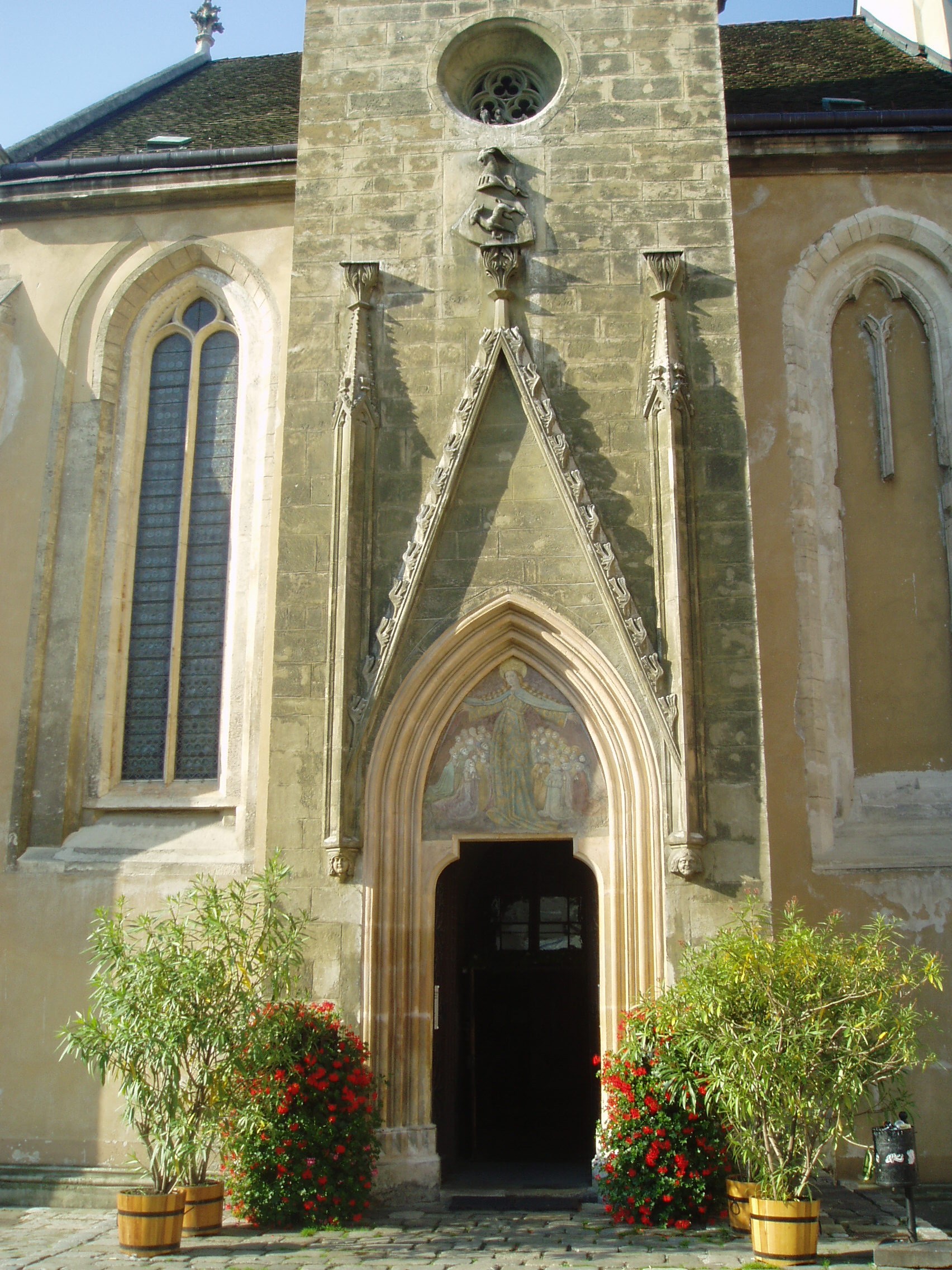 Nyilvános 1329 | 1798 | Sopron, Fő tér: Kecske-templom | A soproni Fő tér ékességét, a gótikus Kecske–templomot és a hozzá tartozó ferences kolostort a XIII. század második felében kezdték építeni. Tornya a XIV. század első negyedében készült el; mai alakja id. Storno Ferenc 1888–1894 között végzett helyreállításának eredménye. Szokatlan nevét a kapuzat felett látható faragott állatfiguráról kapta (a ma látható kecske Storno Ferenc faragványa, az eredeti a Káptalanteremben van), amelyről kiderítették a kutatók, hogy az építtető Gaisel család címerállata volt. Maga a templom faragott kőből épült, háromhajós, északi oldalán toronnyal díszített kora gótikus épület, berendezése a későbbi századokból származó barokk, illetve rokokó stílusú. Déli hajójának közepén áll egy XV. századból származó, márványból készült szószék. Ebbe ágyazták bele azt a fából faragott szószéket, amelyről állítólag Kapisztrán János prédikált a templom előtt a török ellen. A templom többször volt színhelye országos jelentőségű ünnepségeknek, reprezentációs alkalmaknak: 1553 és 1681 között öt alkalommal falai között tartották az országgyűlési ünnepeket; 1625-ben királyt (III. Ferdinánd), 1622-ben és 1681-ben királynét koronáztak benne. 1787-ben feloszlatták a ferences rendet, s az épületegyüttest később a bencések kapták meg. A fénykép 2008 júniusában készült. Felh. irod.: Czellár Katalin: Sopron. 3. jav. kiad. Bp. Panoráma, 2000 Albert Tibor: Sopron–Vas vármegyei útikönyv. Magyar múlt — osztrák–magyar jelen. Kőszeg, Városkapu Kiadó, 2005 |