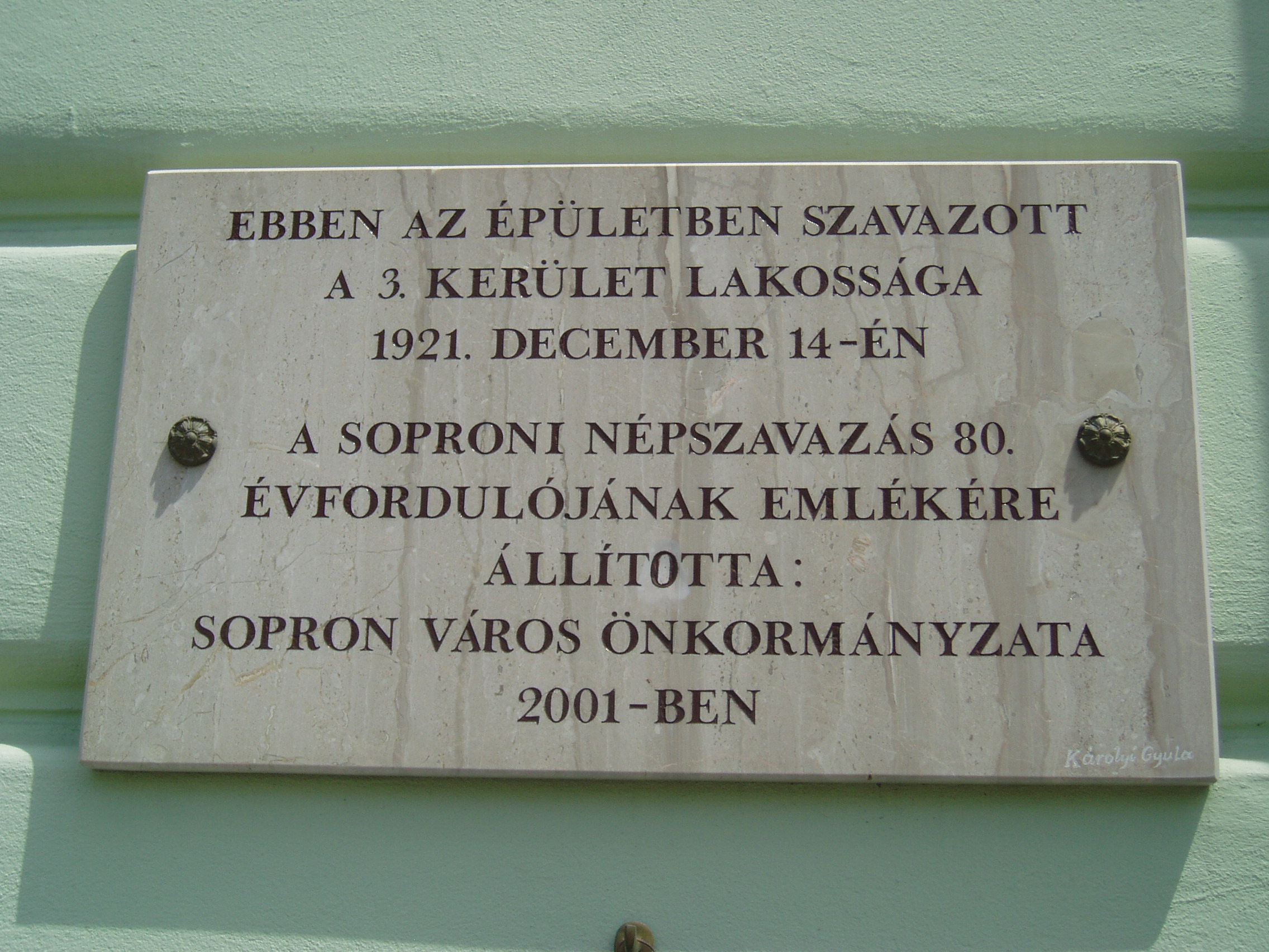 Nyilvános 1364 | 1820 | Sopron, Halász utca 25. | A Petőfi Sándor Általános Iskola falán emléktábla hirdeti, hogy valaha helyén az a kaszárnya állt, amelyben 1839/40 telén katonáskodott Petőfi Sándor. Egy másik tábla arra emlékezik, hogy a mai iskolaépület volt az egyik helyszíne a soproni népszavazásnak 1921. december 14-én. A fénykép 2008 júniusában készült. |