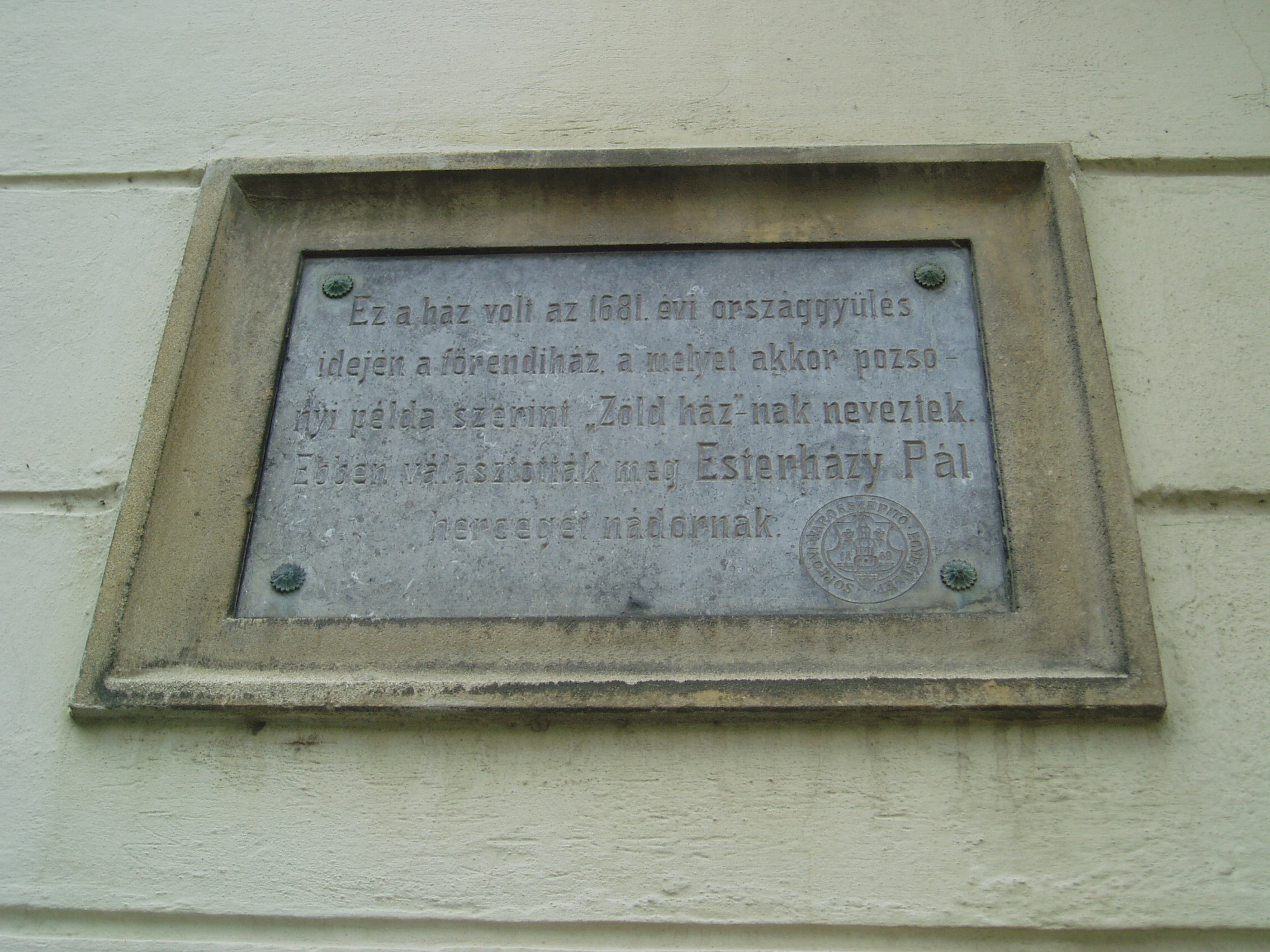 Nyilvános 1334 | 1645 | Sopron, Hátsókapu 2. | Az ún. Caesar–ház hatalmas reneszánsz sarokerkélyével a városkép jellegzetes eleme. Helyén valamikor több kisebb, valószínűleg a XV. században épült lakóház állt. Az 1676-ban Sopron belvárosát sújtó nagy tűzvész után ezek megmaradt részei, valamint a belső városfal maradványainak felhasználásával épült fel e pompás kis városi palota. Dongaboltozatos kapualjában megmaradtak a középkori ülőfülkék. Udvari szárnyának emeletén toszkán oszlopos, köríves árkádsor van. Az udvarból a falszorosban kialakított kertbe juthatunk, ahol látható a római és a ráépült középkori városfal, amelyet ablakokkal áttörve az épület hátsó homlokzataként használtak fel. Két emeleti termében megmaradt az 1700 körül készült, kora barokk ornamentális stukkómennyezet. Az 1681-es országgyűlés idején ebben az épületben ülésezett a főrendiház, ekkor választották Magyarország nádorává Esterházy Pál herceget, aki Harmonia caelestis című kantátasorozatával beírta nevét a magyar zenetörténetbe is. Az eseményt a Soproni Városszépítő Egyesület körpecsétjével ellátott emléktábla örökíti meg az épület homlokzatán. A fénykép 2008 júniusában készült. Felh. irod.: Czellár Katalin: Sopron. 3. jav. kiad. Bp. Panoráma, 2000 |