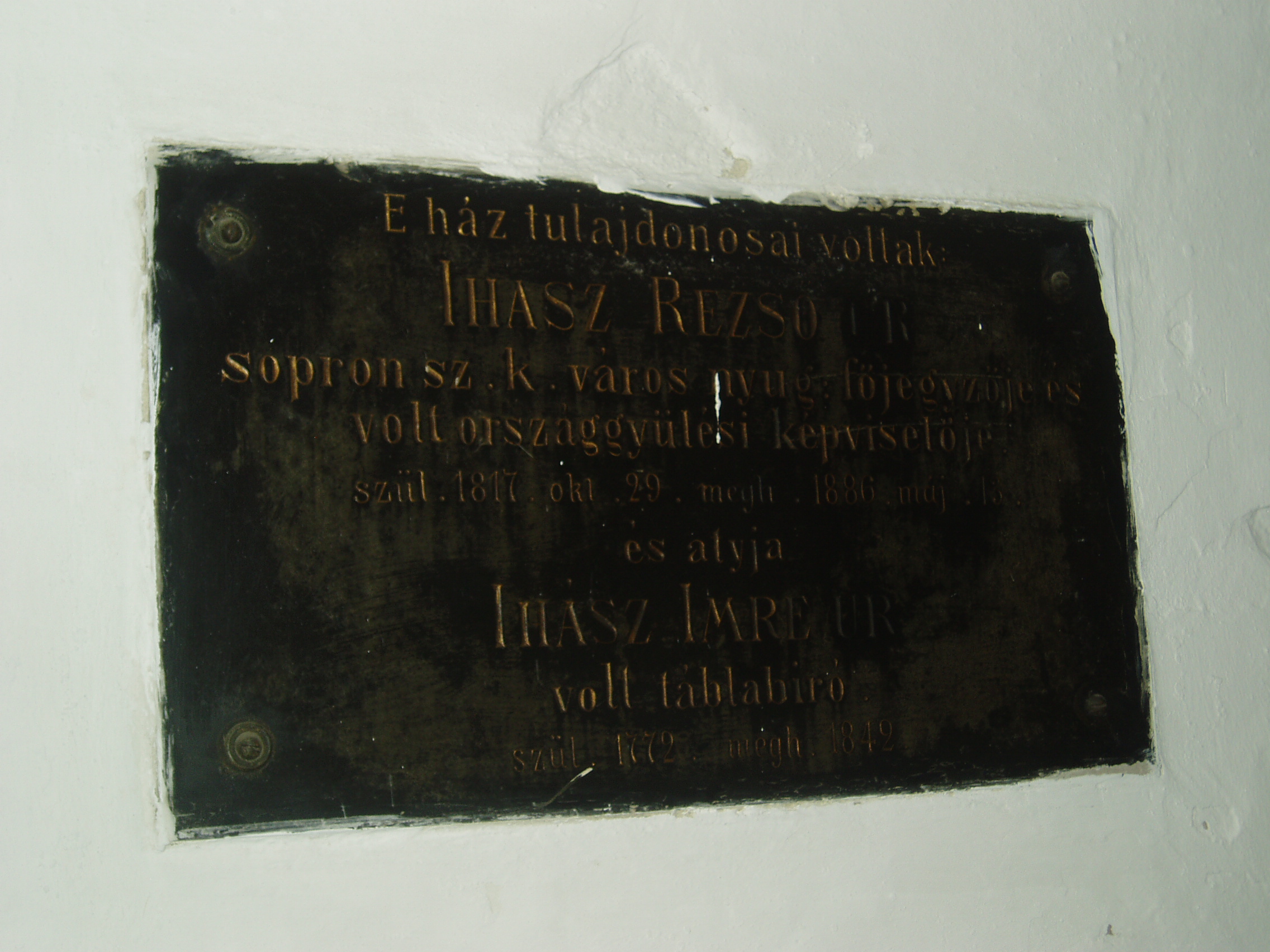 Nyilvános 1334 | 1702 | Sopron, Hátsókapu 2. | Az ún. Caesar–ház hatalmas reneszánsz sarokerkélyével a városkép jellegzetes eleme. Helyén valamikor több kisebb, valószínűleg a XV. században épült lakóház állt. Az 1676-ban Sopron belvárosát sújtó nagy tűzvész után ezek megmaradt részei, valamint a belső városfal maradványainak felhasználásával épült fel e pompás kis városi palota. Dongaboltozatos kapualjában megmaradtak a középkori ülőfülkék. Udvari szárnyának emeletén toszkán oszlopos, köríves árkádsor van. Az udvarból a falszorosban kialakított kertbe juthatunk, ahol látható a római és a ráépült középkori városfal, amelyet ablakokkal áttörve az épület hátsó homlokzataként használtak fel. Két emeleti termében megmaradt az 1700 körül készült, kora barokk ornamentális stukkómennyezet. Az 1681-es országgyűlés idején ebben az épületben ülésezett a főrendiház, ekkor választották Magyarország nádorává Esterházy Pál herceget, aki Harmonia caelestis című kantátasorozatával beírta nevét a magyar zenetörténetbe is. Egy fekete márványtábla a ház egykori tulajdonosairól emlékezik meg: Ihász Imre (1772-1842) táblabíróról és fiáról, Ihász Rezső (1817-1886) főjegyzőről, országgyűlési képviselőről. A fénykép 2008 júniusában készült. Felh. irod.: Czellár Katalin: Sopron. 3. jav. kiad. Bp. Panoráma, 2000 |
