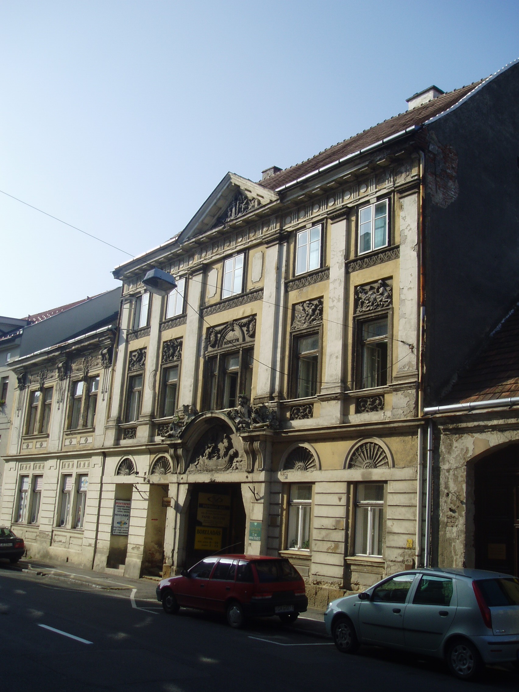 Nyilvános 1340 | 1722 | Sopron, Rákóczi utca 39. | A kétemeletes, klasszicista stílusú lakóház 1816-ban Hild vencel tervei szerint Lenk Sámuel nagykereskedő számára épült gazdag szobrászati díszítésekkel. Az övpárkány és a kapu felett a Lenk kereskedőcsalád cégére, két mór faragott figurája látszik. A kő dombormű a csodálatos halászatot ábrázolja. A kép 2008 júniusában készült. Felh. irod.: Czellár Katalin: Sopron. 3. jav. kiad. Bp. Panoráma, 2000 |