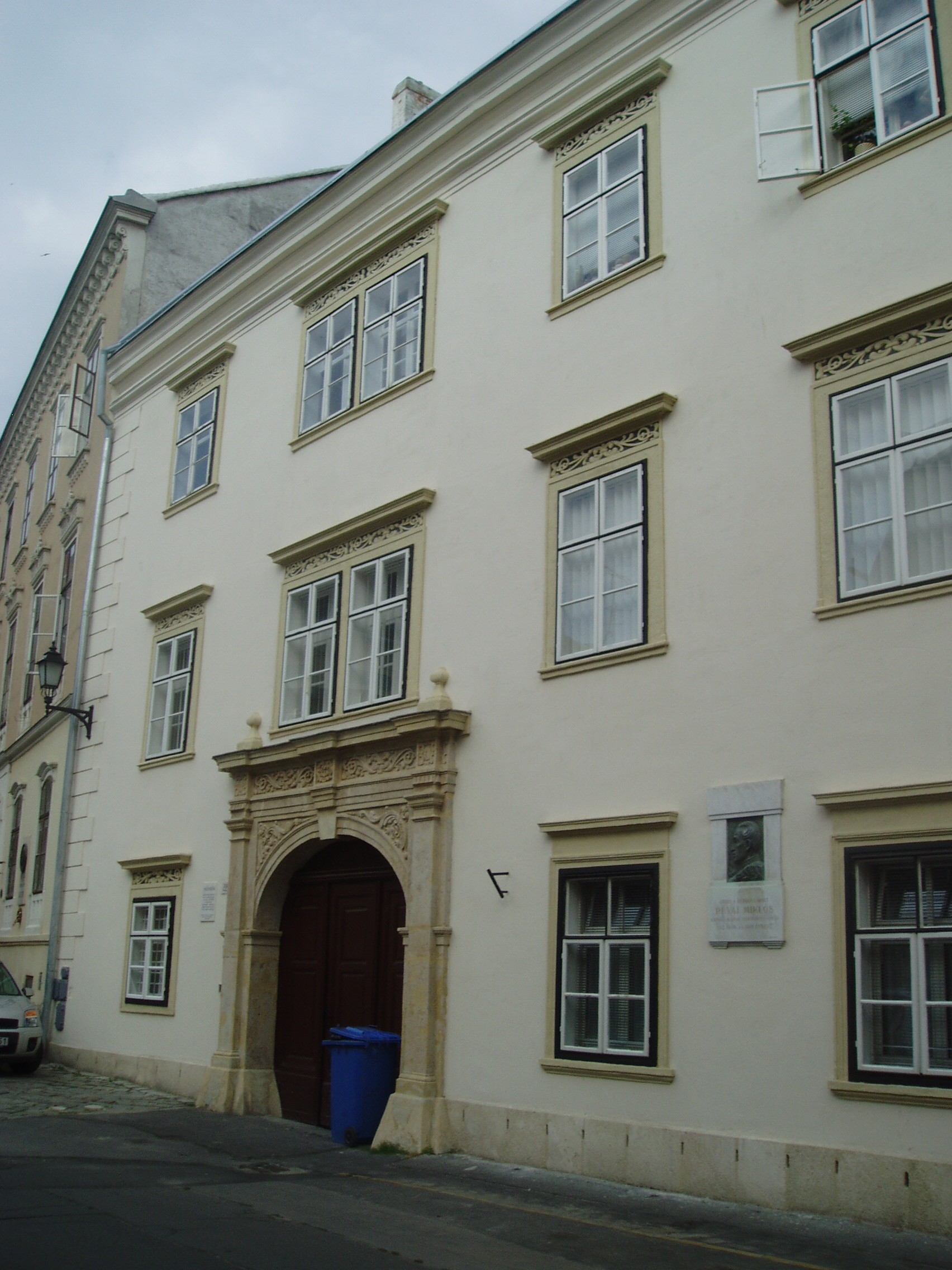 Nyilvános 1333 | 1947 | Sopron, Szent György utca 22. Sax-ház | A középkori eredetű, kétemeletes lakóház késő reneszánsz homlokzata a XVIII. század második feléből származik. Tulajdonosai főként patríciusok, főurak, katonatisztek voltak. 1800 körül itt lakott Révay Miklós, a neves nyelvész. Ezt a tényt domborműves emléktábla is megörökíti. A kép 2008 júniusában készült. Felh. irod.: Czellár Katalin: Sopron. 3. jav. kiad. Bp. Panoráma, 2000 |