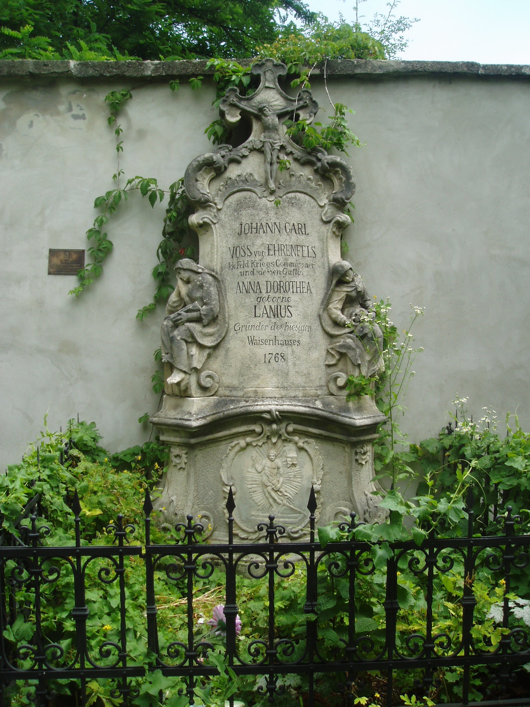 Nyilvános 1377 | 1660 | Sopron, Szent Mihály utca: Szent Mihály-templom udvara | A Szent Mihály-templom körül egykor temető volt, várfallal körülvéve. Síremlékei közül néhány megmaradt. A képen a Voss-házaspáré látható 1768-ból. A kép 2008 júniusában készült. Felh. irod.: Czellár Katalin: Sopron. 3. jav. kiad. Bp. Panoráma, 2000 |