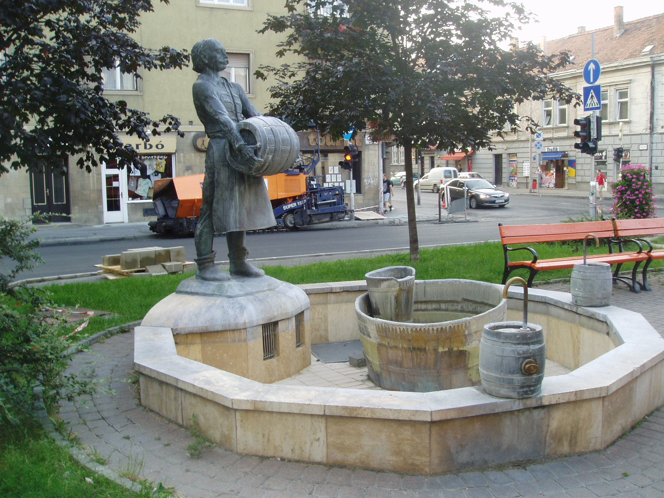 Nyilvános 1398 | 1784 | Sopron, Színház utca 10. előtt: Sörmester-kút | A Színház utca és az Ógabona tér között 1995-ben állították fel Kapmfl József: Sörmester című, hamar népszerűvé vált szoborkompozícióját, amely ivókútként is szolgál. A kép 2008 júniusában készült. Felh. irod.: www.szoborlap.hu |
