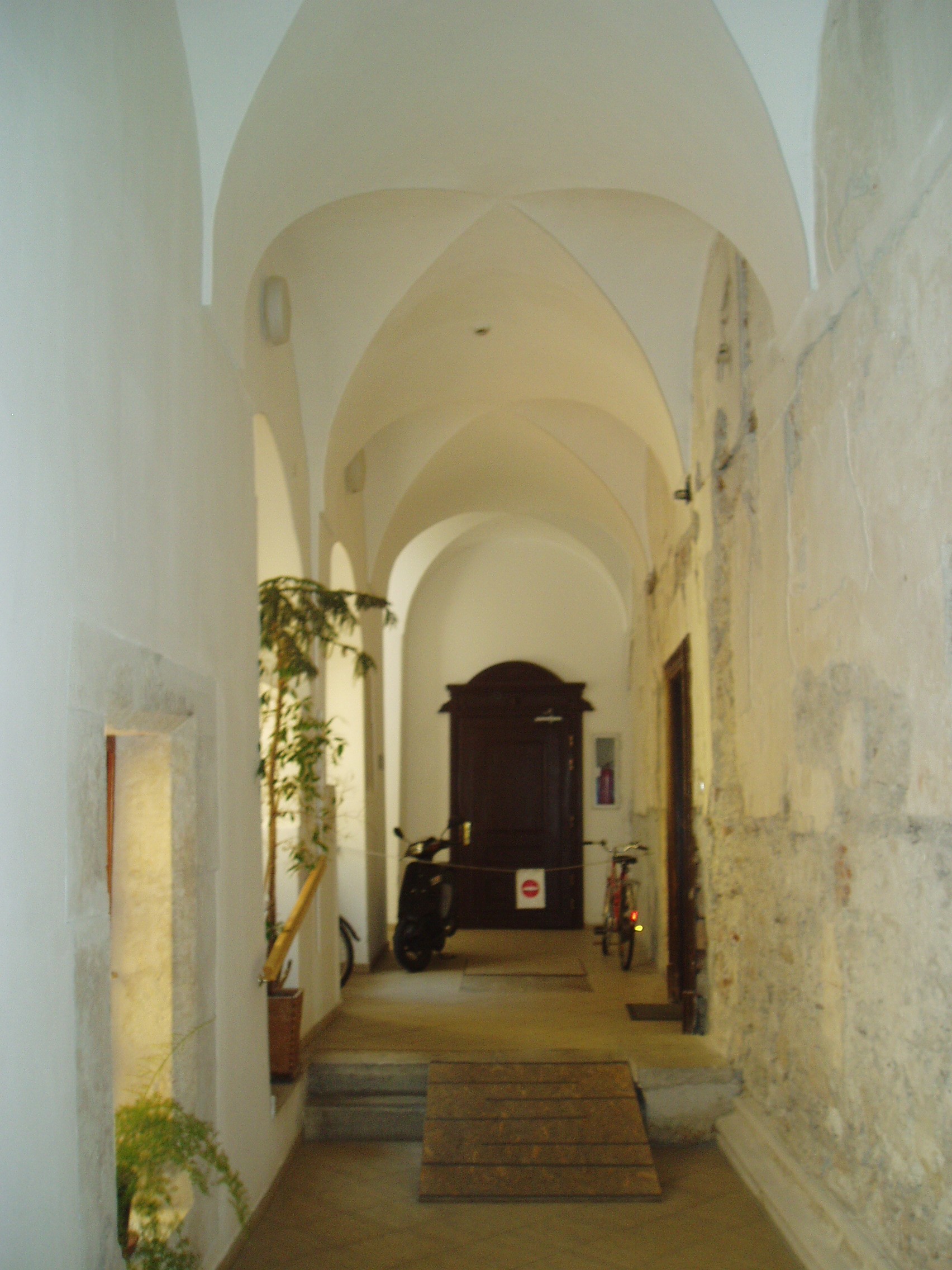 Nyilvános 1369 | 1685 | Sopron, Templom utca 1. | A Templom utca bal oldalán a Kecske–templomhoz (lásd: Sopron, Fő tér) kapcsolódik az egykori bencés rendház két udvart körülfogó, kétemeletes, nagytömegű, de igénytelen külsejű épülete. A templommal együtt a ferencesek számára épült, majd 1802-ben a bencések kapták meg. E hajdani kolostor tartozéka a látogatók számára a templomból megközelíthető Káptalan–terem, Sopron város egyik legszebb gótikus műemléke (lásd: Sopron, Fő tér. Kecske-templom, Káptalan terem). A képen a rendház folyosója látható. A kép 2008 júniusában készült. Felh. irod.: Czellár Katalin: Sopron. 3. jav. kiad. Bp. Panoráma, 2000 |