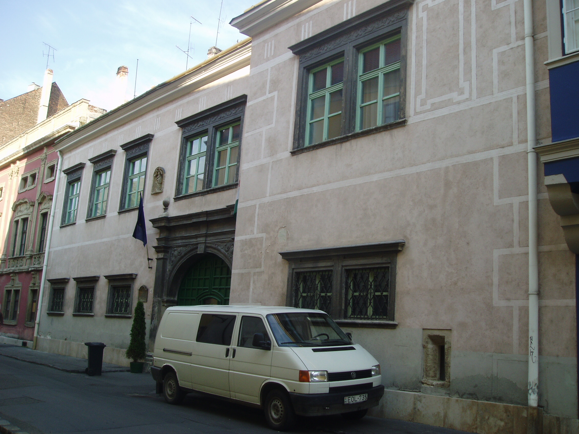 Nyilvános 1359 | 1674 | Sopron, Templom utca 4. Esterházy-palota | A Templom utca 2. számú házhoz hasonlóan ez a középkori eredetű épület is az Esterházy család tulajdona volt 1614-től egészen 1945-ig, előtte pedig Oláh Miklós, a neves humanista érsek családjáé volt. A XVII. századból a kapu és az udvari loggia őrződött meg; homlokzata, amely mintegy folytatása a másik Esterházy–palotának, a XVIII. század közepéről származik. Ebben az épületben állapították meg 1921-ben az antanthatalmak megbízottjai a Sopron és környékének sorsát eldöntő népszavazás eredményét. Az evangélikus templom harangozója hallotta meg elsőként a polgárok közül a jó hírt, s ő kezdte el örömében a harangozást, amihez azután Sopron többi temploma is csatlakozott. A kép 2008 júniusában készült. Felh. irod.: Czellár Katalin: Sopron. 3. jav. kiad. Bp. Panoráma, 2000 |