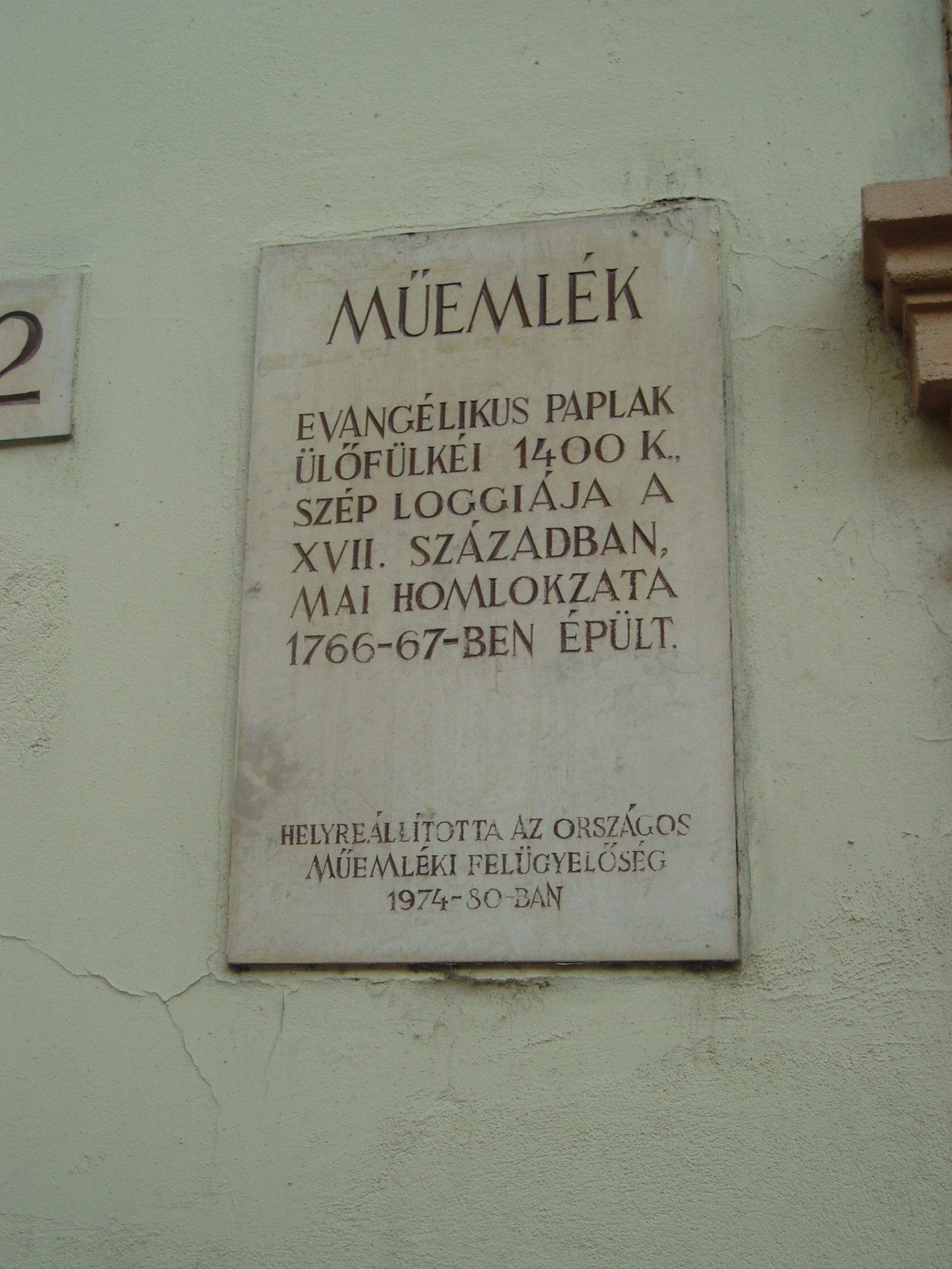 Nyilvános 1337 | 1613 | Sopron, Templom utca 12. | Az eredetileg egyemeletes középkori lakóházra a XVII. századi késő reneszánsz, kora barokk átépítése során került a bejárati kapu felett félkörívesen kidomborodó zárt erkély, és ebből az időből kelteződik az udvari front kialakítása is. 1770 körül építették rá a második emeletet, amikor a Lassberg grófi család birtokába került. Az első emeleti nagyteremben ekkor városszerte híres bálokat rendeztek. 1866-ban vette meg az evangélikus konvent az épületet paplak céljaira, és azóta is az evangélikus egyház tulajdona. Dongaboltozatos, hosszú kapubejárójában a két oldalt kőráccsal díszített gótikus ülőfülkesor 1400 körül készült. A középkori eredetű épület 1866-ban került az evangélikus egyház tulajdonába, előbb paplakként hasznosították, majd ez lett Evangélikus Országos Múzeum soproni kiállítóhelye. A kép 2008 júniusában készült. Felh. irod.: Czellár Katalin: Sopron. 3. jav. kiad. Bp. Panoráma, 2000 |