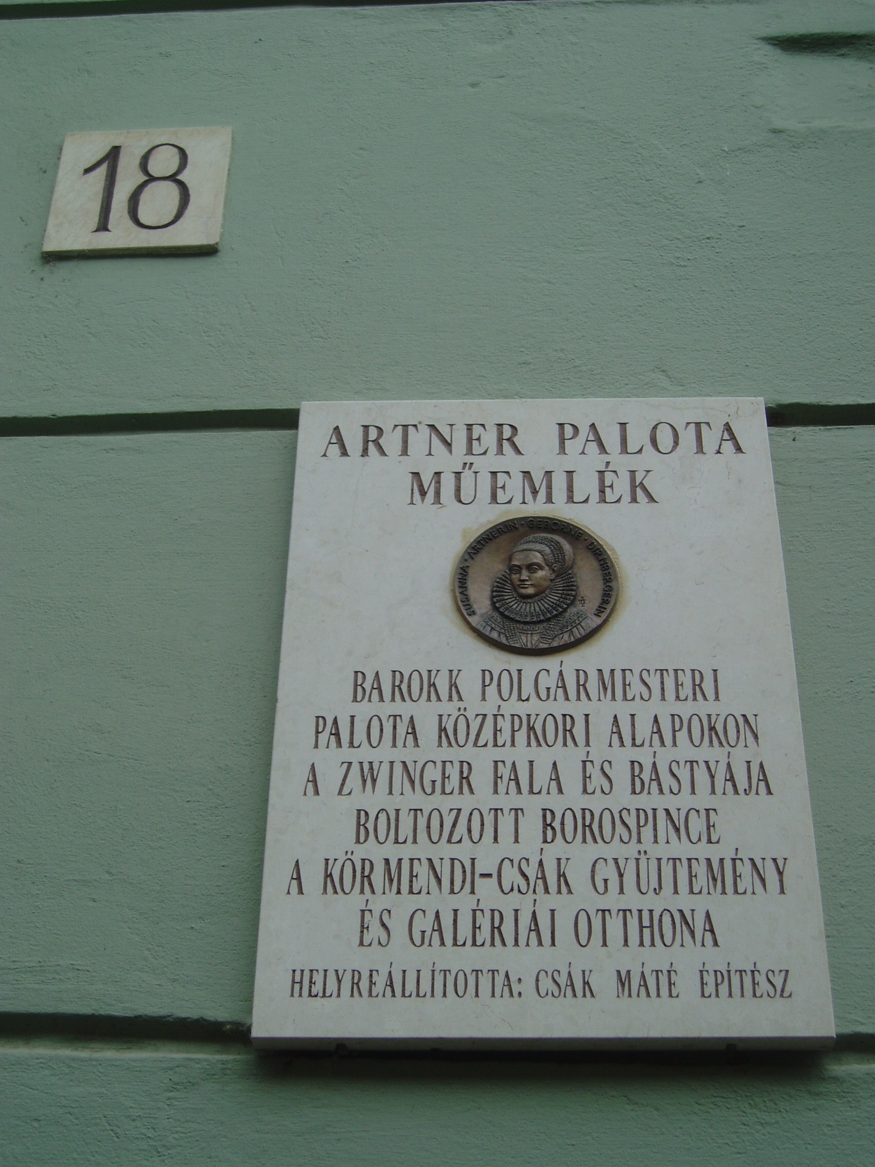 Nyilvános 1334 | 1660 | Sopron, Templom utca 18. Artner-palota | Az egyemeletes barokk lakóház első ismert tulajdonosa Artner Vilmos volt. A kapu fölötti címeren az ő neve és az 1723-as évszám olvasható. A kép 2008 júniusában készült. Felh. irod.: Czellár Katalin: Sopron. 3. jav. kiad. Bp. Panoráma, 2000 |