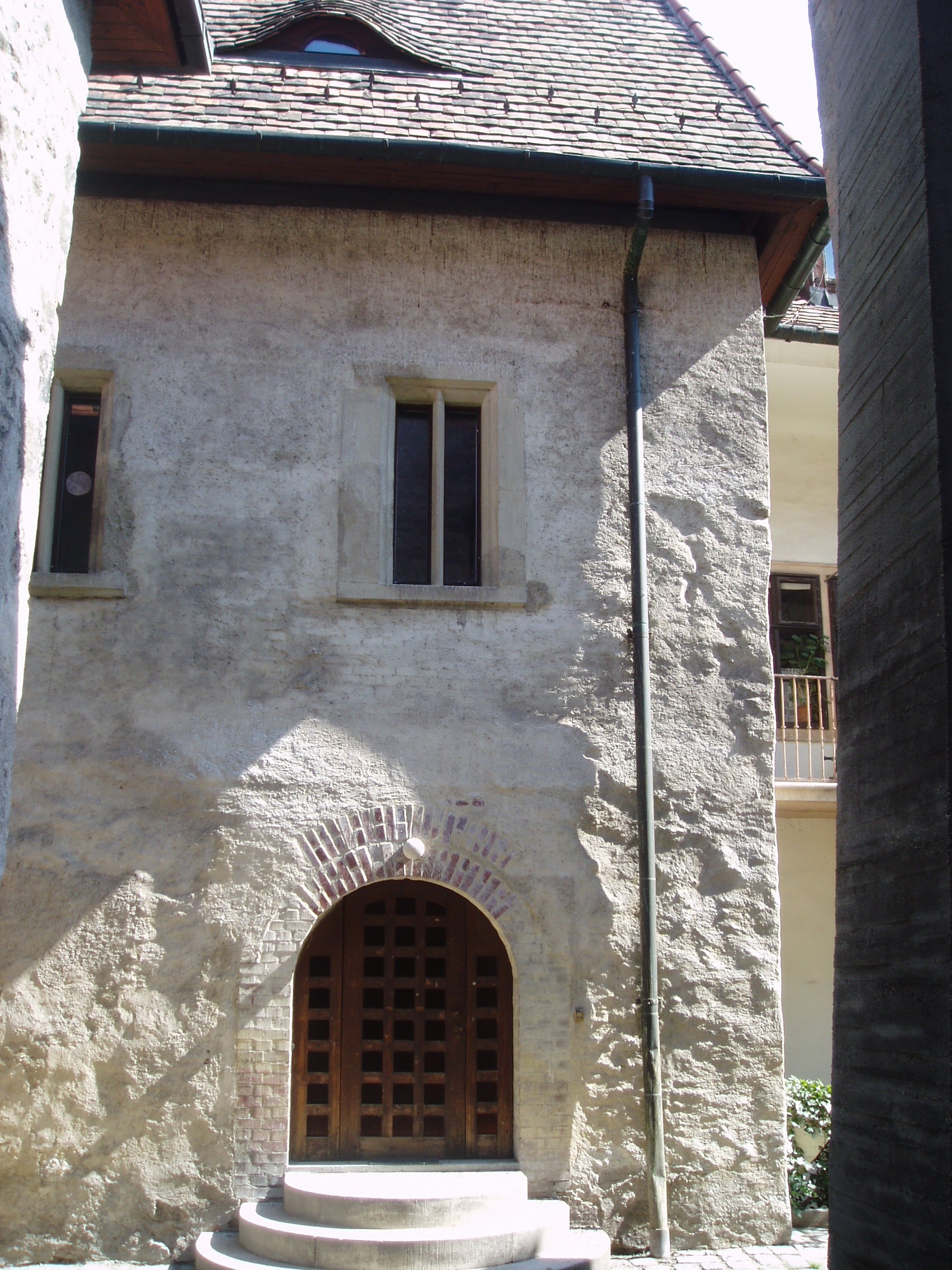 Nyilvános 1358 | 1639 | Sopron, Új utca 11. | A középkori eredetű lakóház középkori zsinagógát rejt. Az első zsidók a XIII. században települtek be Sopronba. 1370 körül épült ez az imaházuk, egy Izrael nevű bankár magánzsinagógájaként. A többször átalakított épület egyszerű barokk homlokzatának bal oldalán nyílik a kosáríves kapuzat, amelyen át beléphetünk a középkori templomba: elsőként egy utcára nyíló, boltozatos terembe, majd innét magába a zsinagógába. A képen a boltozatos terem bejárata látható. A kép 2008 júniusában készült. Felh. irod.: Czellár Katalin: Sopron. 3. jav. kiad. Bp. Panoráma, 2000 |