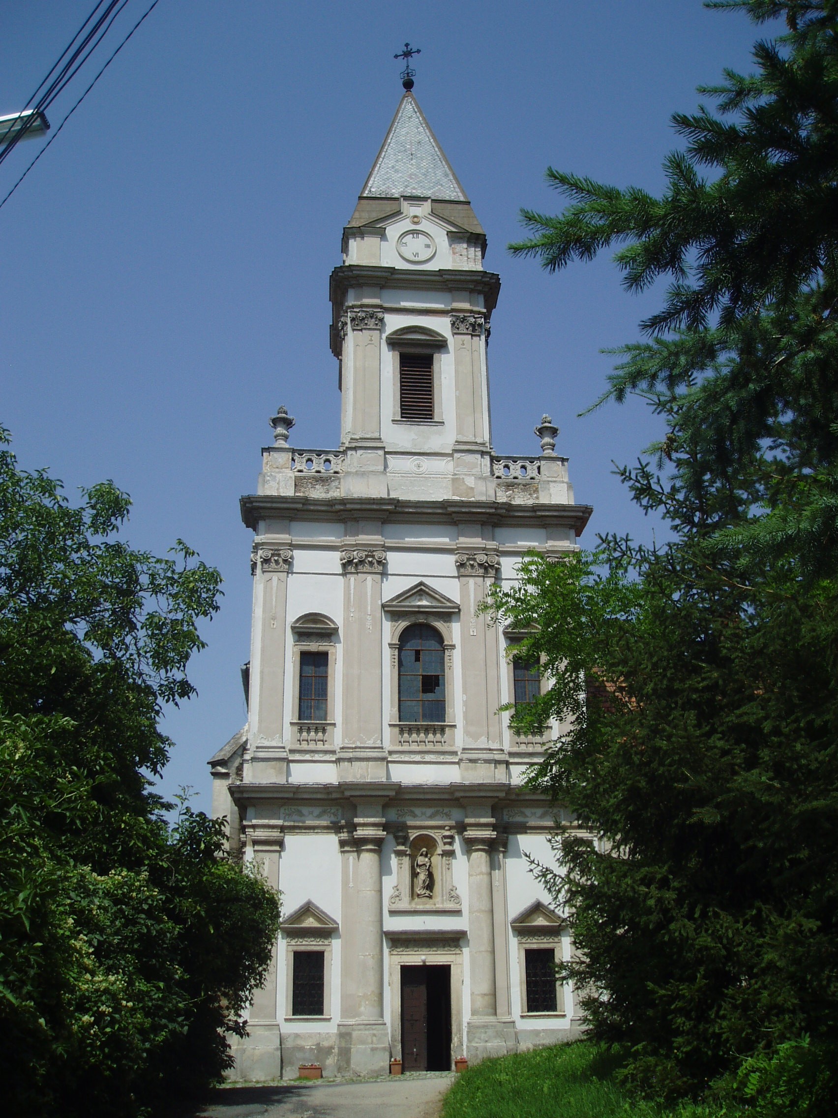 Nyilvános 1408 | 2067 | Sopronbánfalva: Kolostorhegy út: Karmelita templom és kolostor | Sopronbánfalva fölött a Sopronból Brennbergbányára vezető út déli oldán magas domb emelkedik. A dombot uraló gótikus eredetű, első formájában a XV. század végén épült templom és a hozzá csatlakozó barokk kolostorszárnyak eredetileg pálos szerzetesek, majd karmelita apácák otthona volt. Az épületegyüttest a település központjával a meredek domboldalban egyenesen húzódó díszes lépcső köti össze, amelyet karmelita-, vagy pálos lépcsőként ismer a köztudat. A lépcső hét lépcsőkarból és hét pihenőből áll. A pihenőkön, a baluszteres mellvéden jobbról-balról egy-egy szent kőszobra áll. A kép 2008 júniusában készült. Felh. irod.: Czellár Katalin: Sopron. 3. jav. kiad. Bp. Panoráma, 2000 |