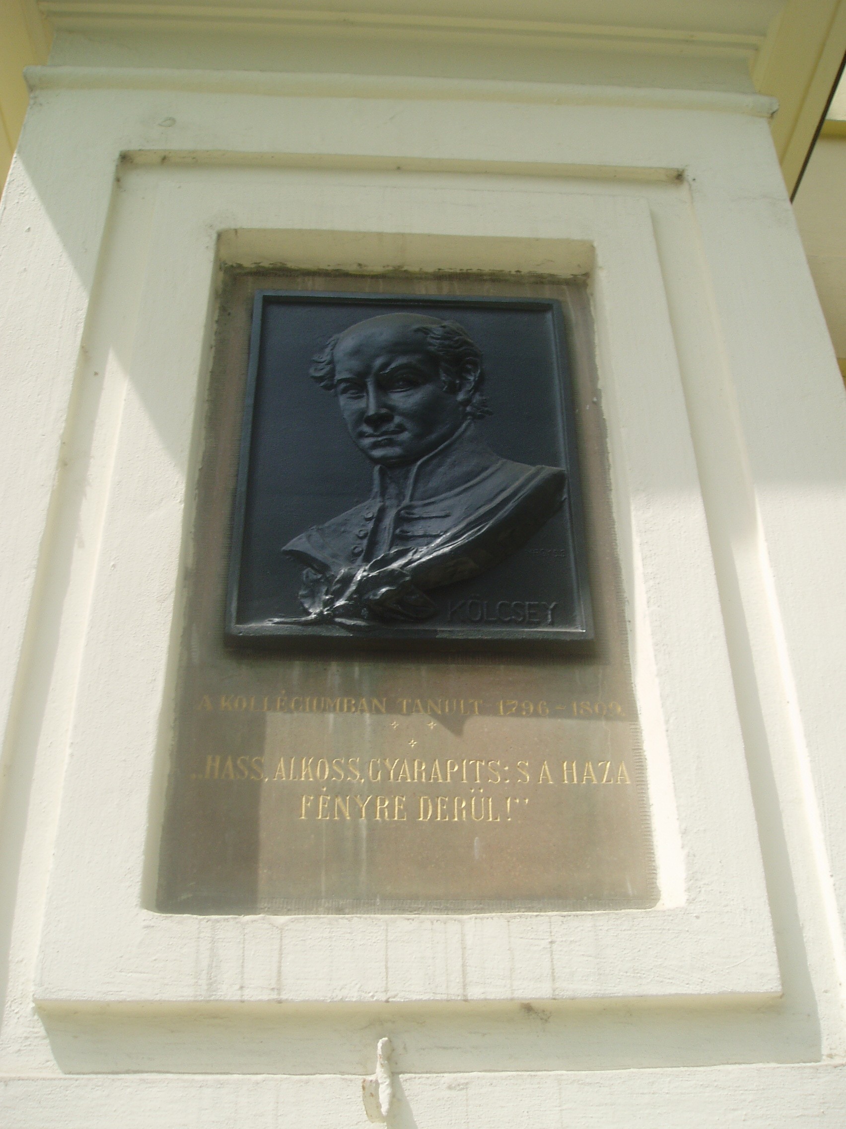 Nyilvános 1464 | 1962 | Debrecen, Kálvin tér 16. Református Kollégium: Kölcsey Ferenc domborműve | A Kollégium mai épülete a magyar klasszicista építészet nagyszerű példája. A főbejárat homlokzatát Nagy Sándor János bronz domborművei díszítik. Kettős oszlopot hordozó széles táblán Kálvin és Zwingli egymással szembeforduló alakja látható. A mellette lévő oszlopon Arany János bronz domborművét találhatjuk, míg a Füvészkert utca felől Csokonai Vitéz Mihály emlékét örökítették meg. Ugyancsak a főbejáraton látható Kölcsey Ferenc portréja, Nagy Sándor János egyik legszebb alkotása. A sort Fazekas Mihály és Móricz Zsigmond portréja egészíti ki. Medgyessy Ferenc bronz domborműve a kollégium hősi halottainak, tanároknak és diákoknak állít emléket. A képen Kölcsey Ferenc domborműve látható, aki tizenhárom éven keresztül volt a Kollégium diákja, a jogot is itt végezte. A fénykép 2006 júniusában készült. Felh. irod.: Kovács Gergelyné: Debrecen. Bp. Panoráma, 1981 Papp Antal: Debrecen. Bp. Panoráma, 1976 Győri L. János: "Egész Magyarországnak és Erdélynek világosító lámpása": a debreceni Református Kollégium története. Debrecen, 2006 |
