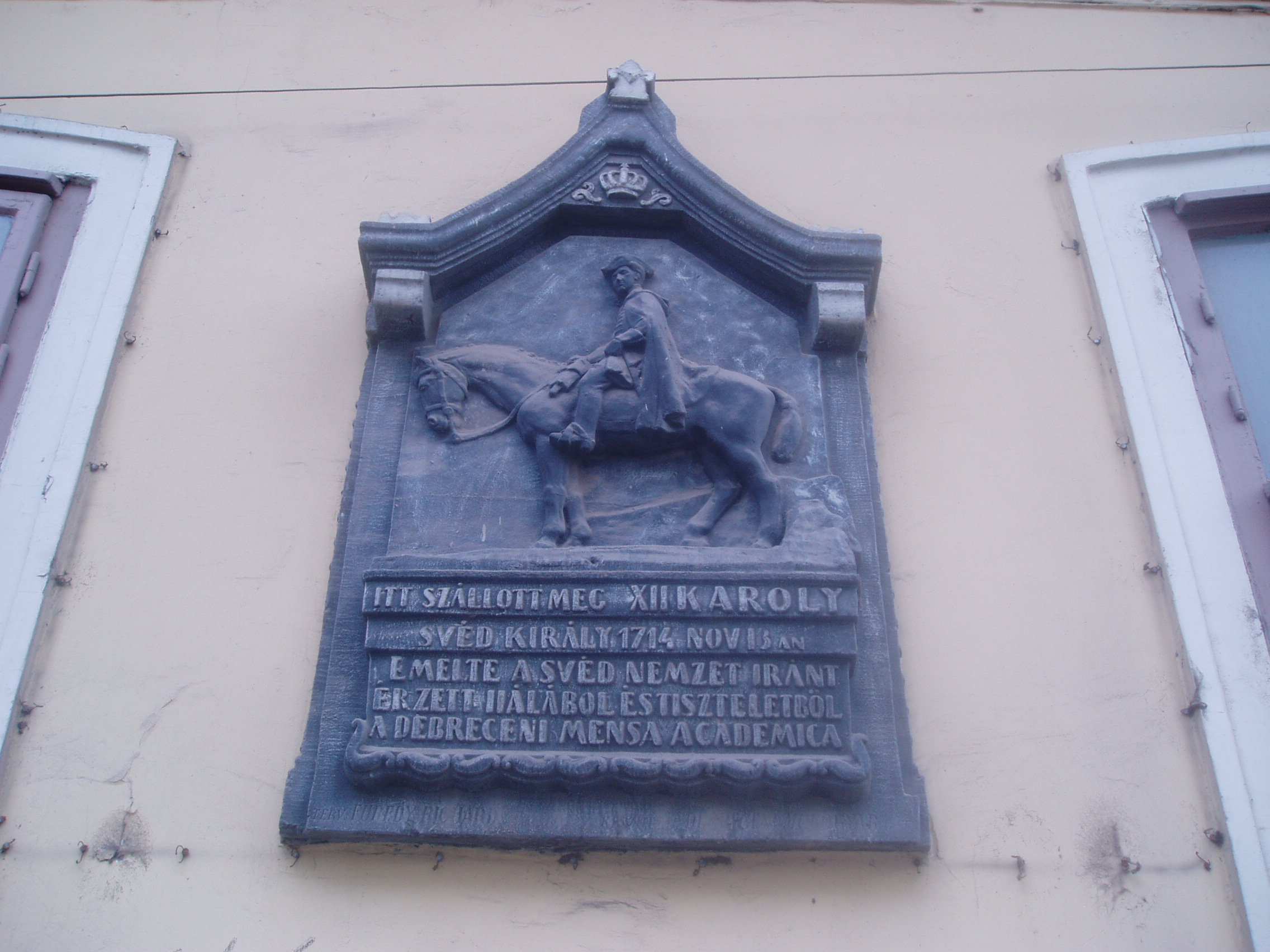 Nyilvános 1468 | 1898 | Debrecen, Széchenyi utca 6. | Debrecen legrégibb fennmaradt lakóháza az 1690-es években emelt patríciusház. A 17. század végén már Diószegi Sámuelé, a város főbírájáé, s első postamesteréé is volt. A ház így fogadóként is szolgált. Legnevezetesebb vendége XII. Károly svéd király volt, aki itt szállt meg 1714. november 16-án, amikor Törökországból hazafelé tartott az I. Péter orosz cártól elszenvedett vereség után. Az egykorú források megőrizték, hogy a király, aki nemcsak híres hadvezér és államférfi volt a maga korában, hanem felvilágosult gondolkodó is, igazi lelki gyönyörűséget talált a debreceni főbíró házánál, ahol a kollégium professzoraival, a nagy műveltségű, világot járt házigazdával és más olvasott férfiakkal találkozott. A továbbutazó király elégedetten jegyezte fel, hogy itt, a távoli magyar városban igen jól felszerelt és gazdag könyvtár állt rendelkezésére esti olvasás céljából. Felh. irod.: Papp Antal: Debrecen. Bp. Panoráma, 1976 www.debrecen.hu |