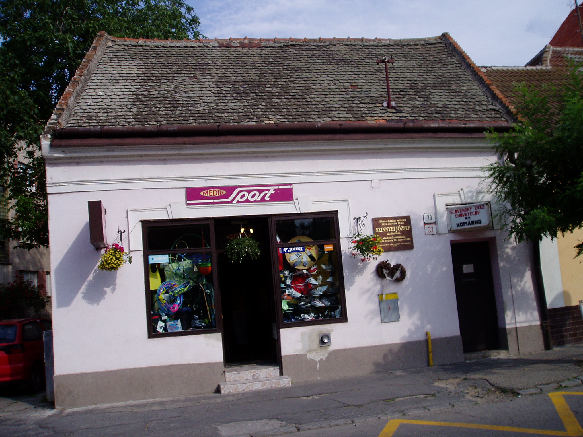 Nyilvános 1990 | 4323 | Komárom (Komárno), Ferences barátok u. 21. | Mint a kis házon elhelyezett emléktáblán is olvasható, ebben a házban született 1830. március 18-án Szinnyei József bibliográfus, könyvtáros, irodalomtörténész, akadémikus. Legfontosabb műve a Magyar írók élete és munkái, mely közel 30.000 író részletes életrajzát illetve kiadott műveinek jegyzékét tartalmazza, s ma is nagyon fontos forrásmunka. A fénykép 2005. júliusában készült. Felh. irod.: Mácza Mihály: Komárom nevezetességei. Pozsony, Madách-Posonium, 2002 |