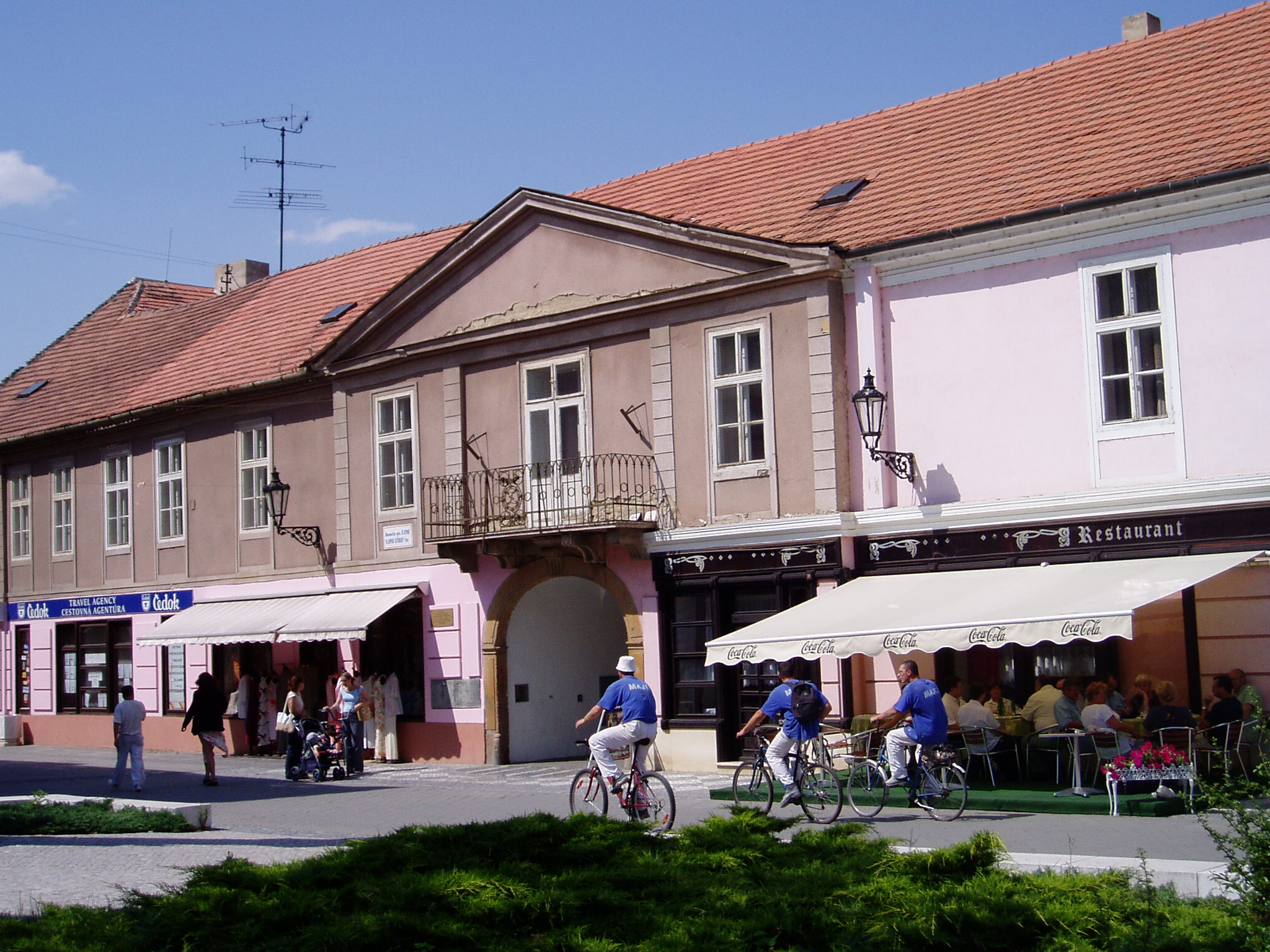 Nyilvános 1499 | 2555 | Komárom (Komárno). Klapka tér 9. Zichy-palota | A Klapka tér legnagyobb épülete a volt Zichy–palota. Zichy Miklós gróf, szabolcsi főispán építtette a XVII. század második felében. Eredetileg barokk stílusú volt, de miután a 1763-as nagy komáromi földrengés romba döntötte, klasszicista stílusban épült újjá, két épületszárnnyal bővülve. Udvarának végén az 1800-as évek elejétől 1827-ig emeletes épület állt, ennek emeleti részén tartották a táncmulatságokat és a színházi előadásokat. Az első hivatásos magyar színtársulat Komáromban Benke József és Kemény János vezetésével lépett fel 1811 májusában (ők a második pesti színtársulatból váltak ki). A társulatban ott volt Balogh István, Déry István, Láng Ádám, Murányi Zsigmond, Murányiné Lefèvre Teréz és a pályája legelején levő, tizennyolc éves Scheckenbach (Schenbach) Róza, aki később Déryné Széppataki Róza néven vált a magyar játékszín történetének állócsillagává. Legközelebb Balogh István székesfehérvári társulata jutott el Komáromba, valamikor 1813 és 1815 között. Szinnyei József szerint ennek a társulatnak Katona József is tagja volt, s Idegen művésznéven fellépett itt a Hamlet címszerepében és saját, Luca széke című darabjában. 1819 októberében Kilényi Dávid kecskeméti társulata érkezett a városba. Előadásaikról Ásvay Jókay József, Jókai Mór édesapja tudósított a helyi sajtóban. A közelmúltban a Zichy–palota udvarán építették ki az ún. Európa udvart. A helyi viszonylatban gigantikus méretű vállalkozás célja, hogy élőben mutassa be harmincöt európai ország építészetét. A városrész egyben Komárom új szolgáltató központja is, üzletekkel, éttermekkel, kávézókkal, valamint egy föld alatti bevásárlóközponttal. A palota első emeletén (bejárat a képen látható kapun a Szentháromság-szobor mellett) a város két híres szülötte, Jókai Mór és Lehár Ferenc emlékkiállítása látható. Különösen a Jókai-kiállítás gazdag eredeti relikviákban. A fénykép 2005. júliusában készült. Felh.irod.: www.komarno.sk Mácza Mihály: Komárom nevezetességei. Pozsony, Madách-Posonium, 2002 Szénássy Zoltán: Rév–Komárom. KT Kiadó, 1998 Tóth László: "...miként hajdan az apostolok" : a komáromi magyar színjátszás története. Dunaszerdahely, Lilium Aurum, 1997 |