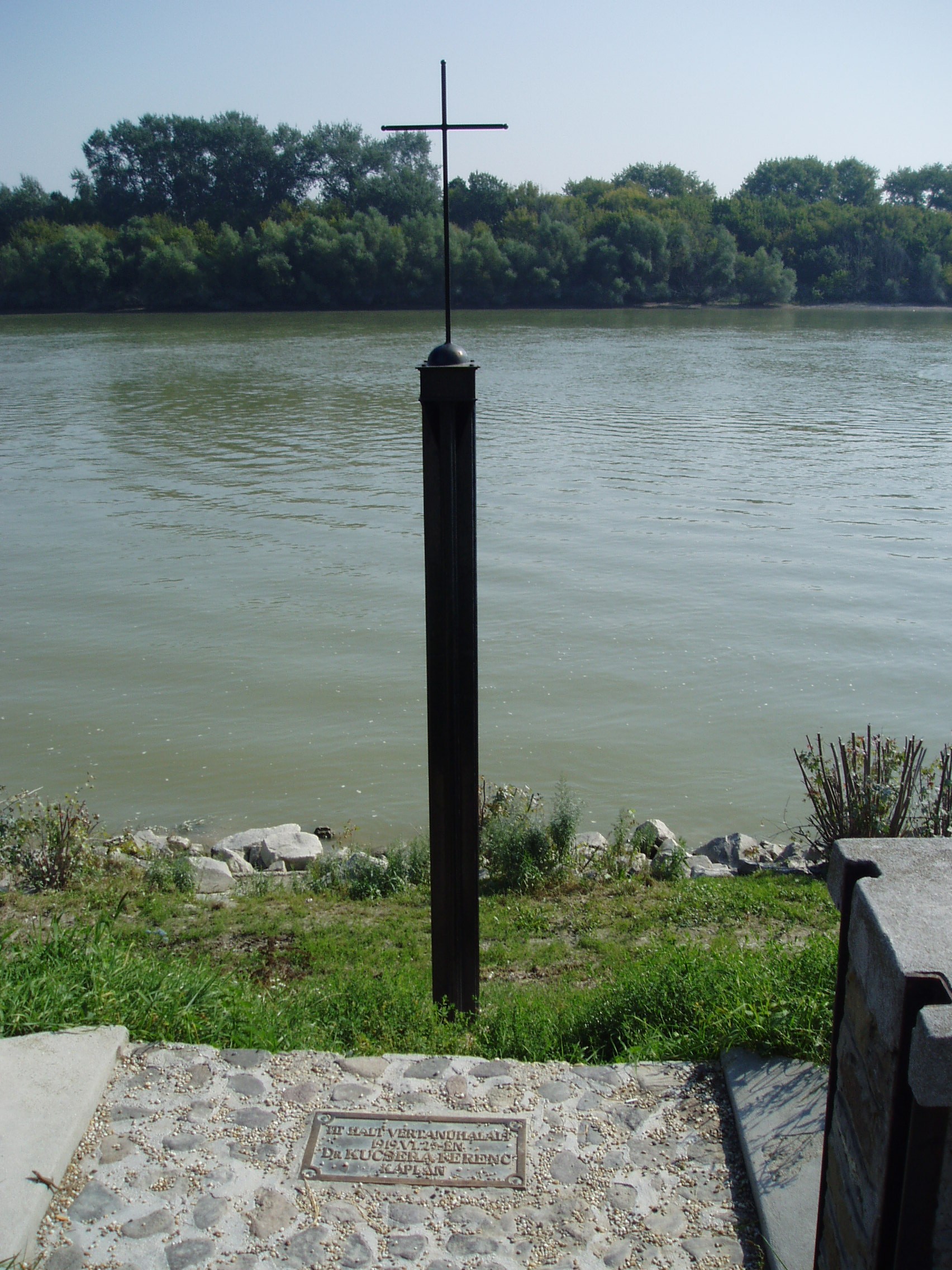 Nyilvános 2084 | 8641 | Szentendre, Dunakorzó: Kucsera Ferenc emlékkereszt | 1919 nyarán ezen a helyen végezték ki Kucsera Ferencet. Dr. Kucsera Ferenc /Léva, 1892 - Szentendre,1919/: A szegény sorsú fiatalembert 1915-ben szentelték pappá és még ebben az évben Szentendrére került mint segédlelkész. A Tanácsköztársaság idején a városban június 24-én a kommunisták elleni szervezett akcióra került sor, amelyhez harangzúgás adta meg a jelet. Ehhez a forradalmárok vádja szerint Kucsera Ferenc adta ki a templom kulcsát, ami pedig nem volt igaz. Mégis halálra ítélték és itt, a Duna parton ki is végezték. A temetőárokban elföldelt holtestét tíz évvel később temették el méltón a Katolikus Kálvária kertjébe. Halálának helyét hamarosan fakereszttel jelölték meg a helybeliek, amelyet az 1950-es években eltüntettek. A ma itt álló kis öntöttvas emlékkeresztet 1993-ban állították. A fénykép 2005 szeptemberében készült. Felh. irod.: Pethő Zsoltné Németh Erika: Szentendre utcanevei: várostörténeti olvasmány . Szentendre, 1996 |
