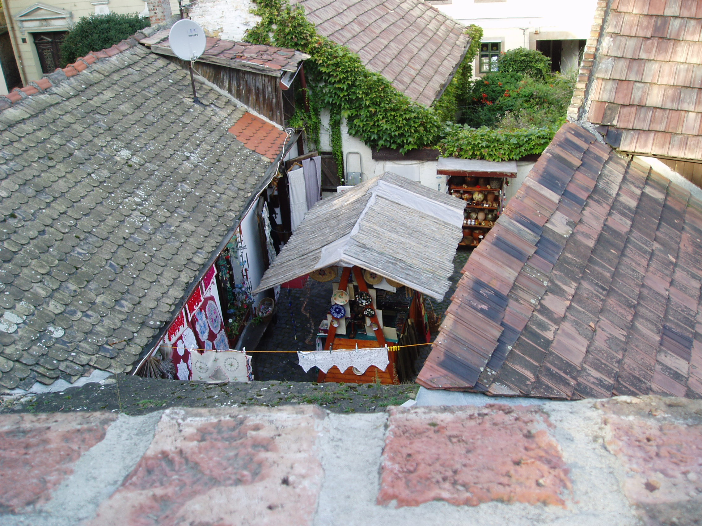 Nyilvános 1447 | 2144 | Szentendre, Várdomb | Szentendre egyik legszebb része a Várdomb, a település középkori központja. Tömör mellvéddel körülvett sétányáról megragadó látvány nyílik az oly sokszor megfestett szentendrei háztetőkre, a kis belső udvarokra, a belvárosra, a Dunára és a túloldali szigetre. A fénykép 2005 szeptemberében készült. Felh. irod.: Szentendre. Szerk. Sándyné Wolf Katalin. Bp. Panoráma, 1985 www.vendegvaro.hu www.szentendre.hu |