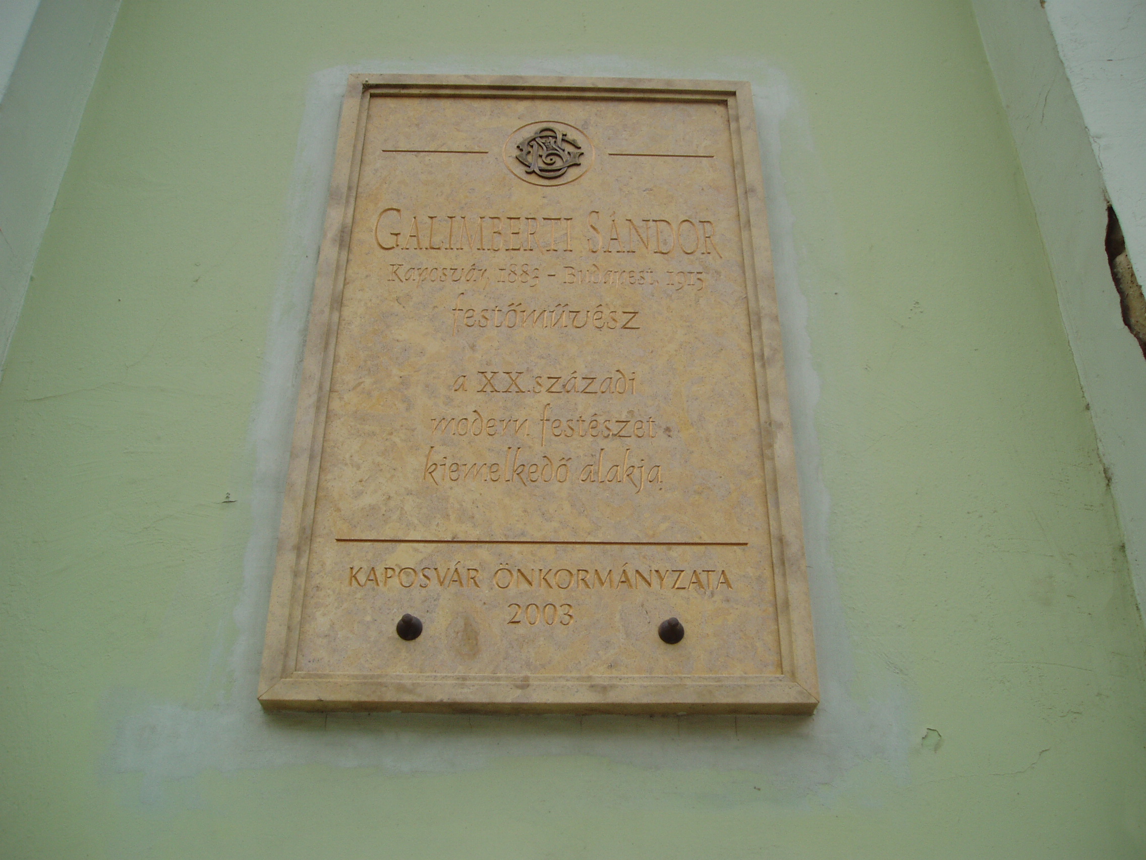 Nyilvános 1544 | 2442 | Kaposvár, Fő utca 2. | A régi gimnázium, majd pénzügyi palota épületén 2003-ban helyezték el a kaposvári születésű Galimberti Sándor festőművész emléktábláját. Galimberti Sándor (1883-1925) a magyar festőművészet első vonalbeli alakjaként a századelő megújító művészeti képviselőihez tartozik. Édesapja Galimberti Alajos (Luigi Galimberti) az 1880-as évek elején települt át Trieszből Kaposvárra. Ő maga is festő volt, aki szívesen örökítette meg a kisvárosi lakók életét rajzaiban, illetve Kaposvár egykori képéről két festménye maradt fenn. Galimberti Sándor pályája nagyobb ívet rajzolt be. Ő a modern európai festészeti eredményeket adaptálta művészetében és a művészettörténet ennek eredményeként a kubofuturista és expresszionista felfogás első hazai képviselőjének tartja. Galimberti nagybányai, müncheni, majd párizsi iskolái után saját stílusát tekintve Rippl-Rónai festészetének szellemében indult és a kaposvári mestert e progresszív, új művészeti irányzatokkal kapcsolja össze. Sajnos műveinek többsége a világháborúban megsemmisült, csak néhány darab maradt fenn, amelyből a művészettörténészek rekonstruálni tudták pályáját. Hagyatékának nagyobb részét a Rippl-Rónai Múzeum birtokolja. A fénykép 2006 márciusában készült. Felh. irod.: www.kaposvar.hu/eloterjesztesek/eloterjesztesek20030227/kotet3/18.doc |